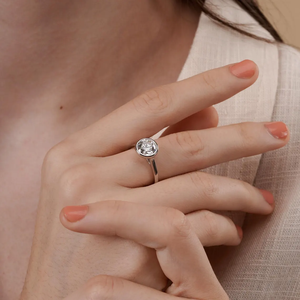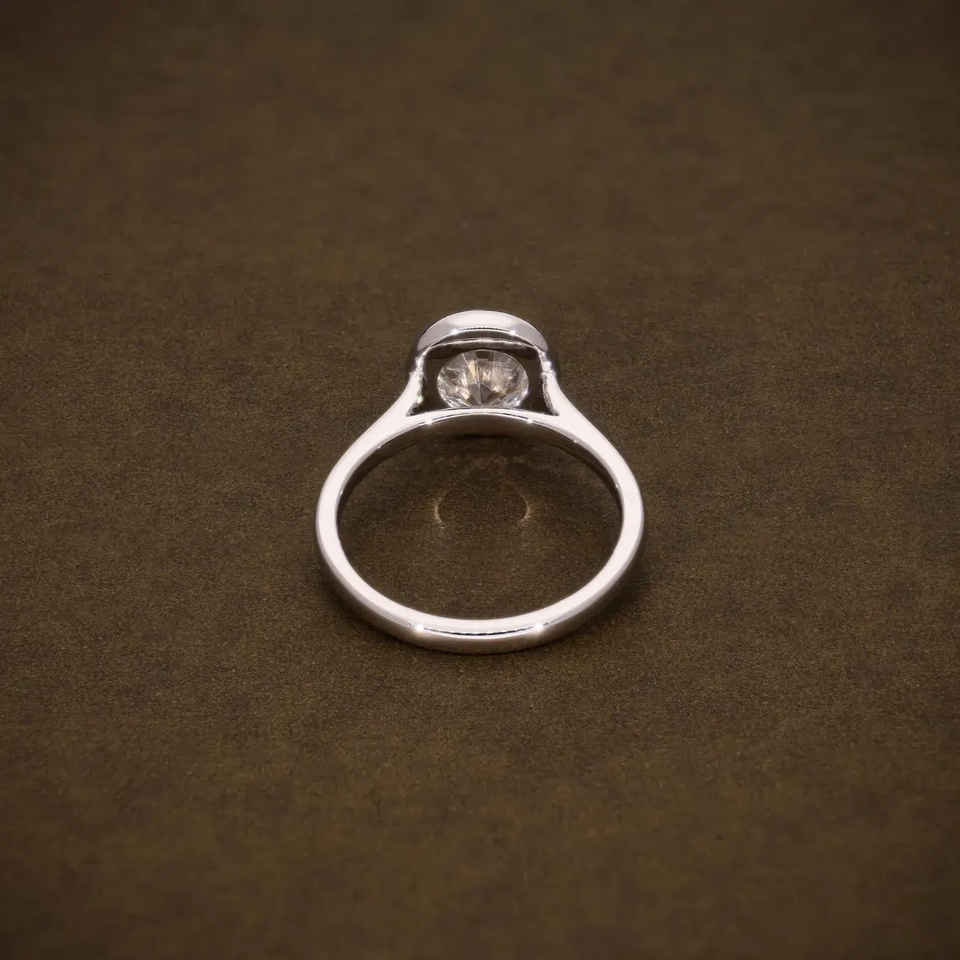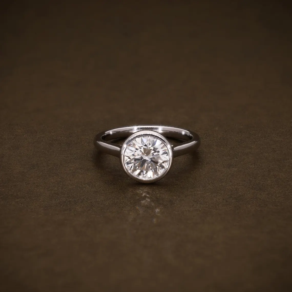 แหวนเพชรทรงกลมเจียระไนแบบบริลเลียนท์ ได้รับการรับรอง VVS2 เพชรสร้างในห้องปฏิบัติการ ฝังแบบเบเซล แหวนหมั้นเพชรเม็ดเดี่ยว ทองคำ 18K สีเหลือง ขาว และโรสโกลด์