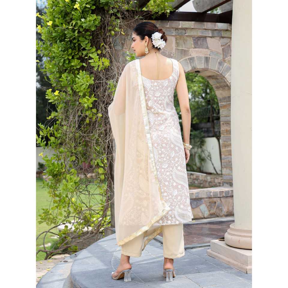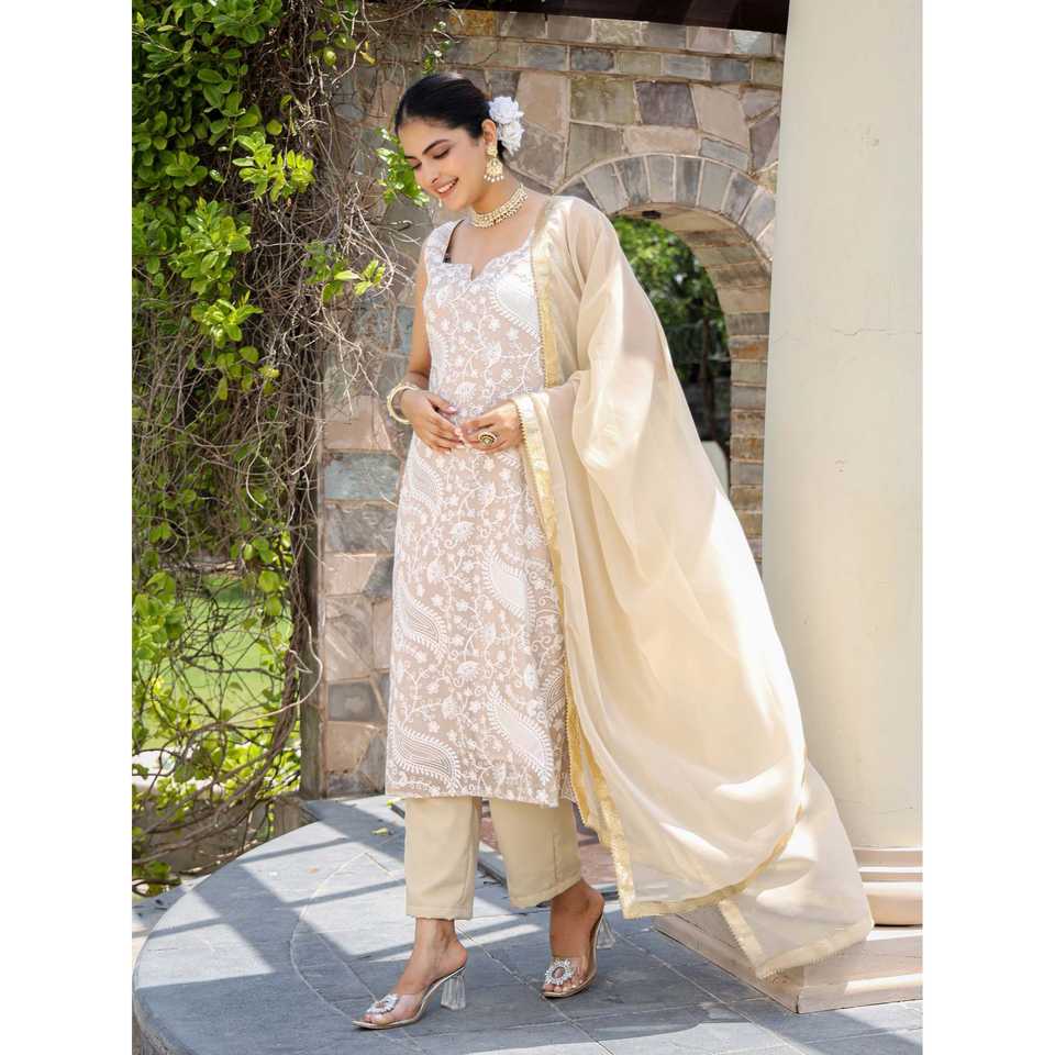 ชุดเซ็ตสูท Vaani XS สีเบจ ผ้าจอร์เจตต์ ปักลายชิกันการี สำหรับผู้หญิง ระบายอากาศได้ดี ผ้าชีฟองเก๋ไก๋ ลายพิมพ์เพสลีย์สไตล์วินเทจ ความยาวระดับข้อเท้า ชุดฤดูร้อนสไตล์ชาติพันธุ์