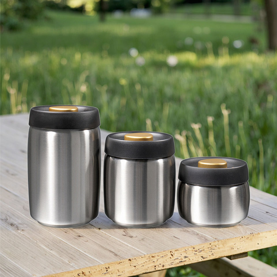 กระป๋องกาแฟแบบปิดผนึกขนาด400มล. 800มล. 1200มล. ใช้ซ้ำได้พร้อมช้อนภาชนะสแตนเลสโหลทรงกลมทรงกลมสำหรับใส่กาแฟ