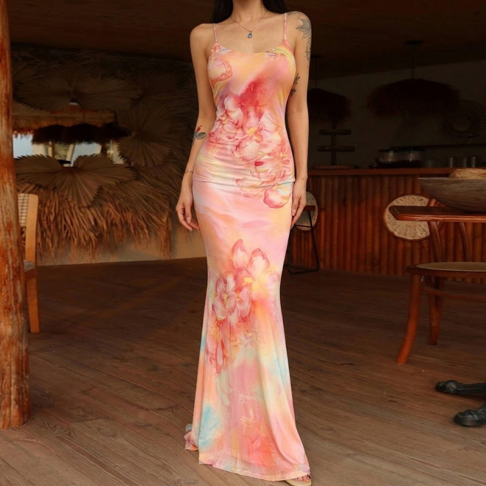 เดรสยาวทรงเข้ารูป สายเดี่ยว ผ้าตาข่ายพิมพ์ลายดอกไม้ดิจิทัล เอวสูง ยืดหยุ่นได้ดี ทรงบอดี้คอน ปลายหางปลา เหมาะสำหรับวันพักผ่อน