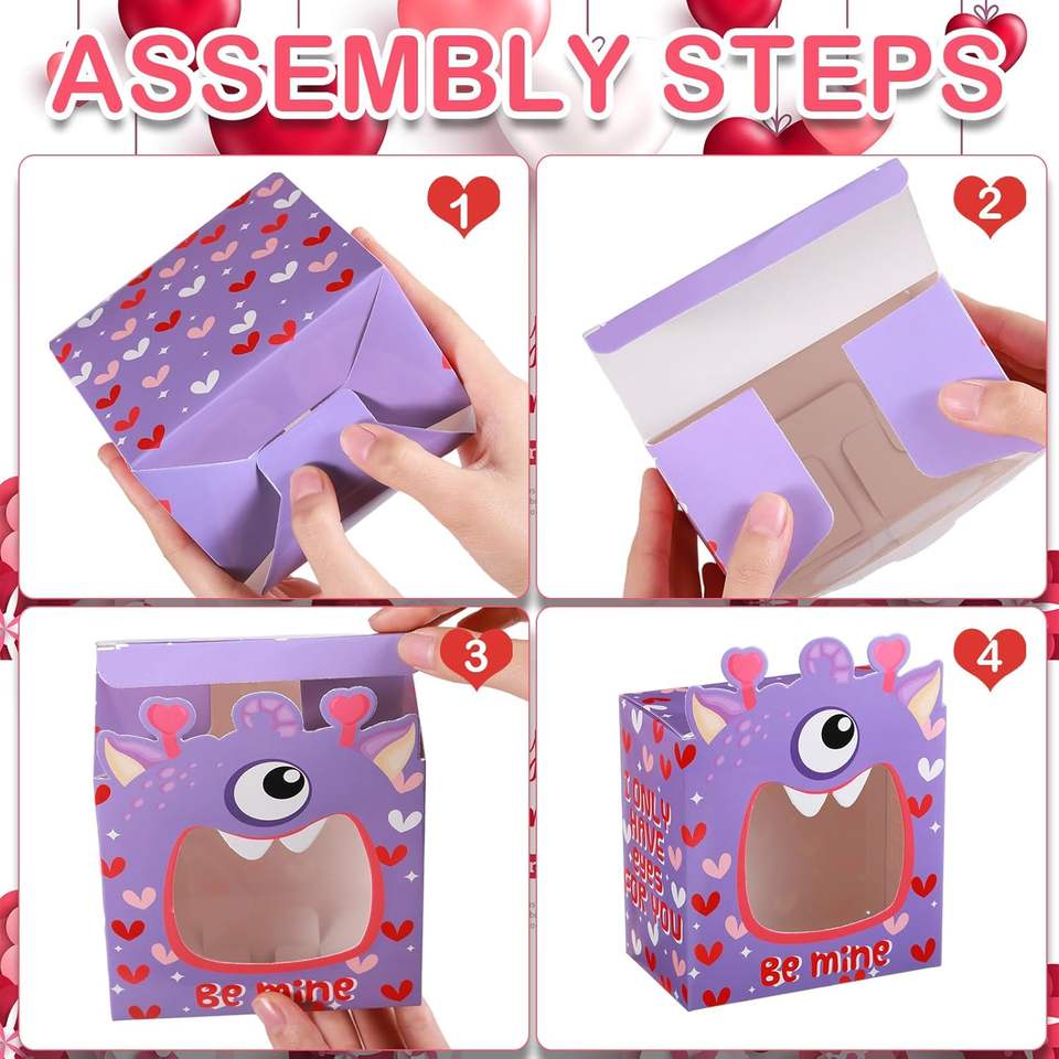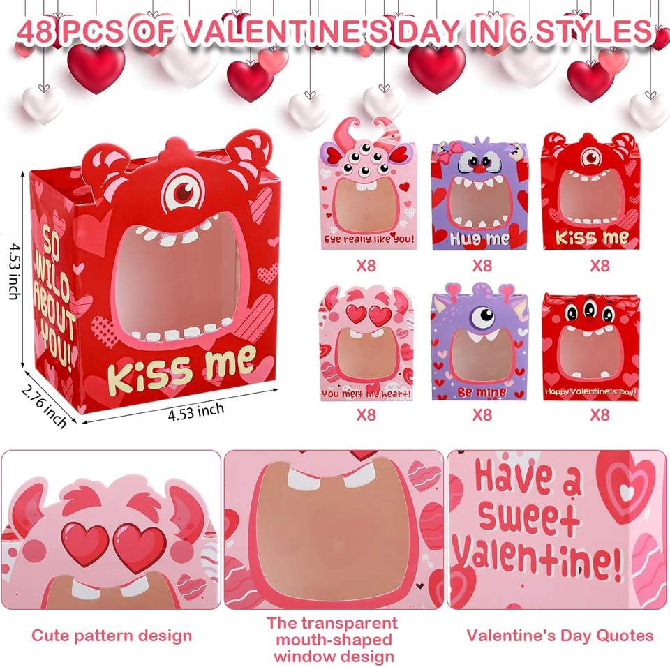 กล่องขนมวาเลนไทน์พร้อมหน้าต่าง PVC กล่องคุกกี้คัพเค้กวาเลนไทน์ลายมอนสเตอร์สำหรับงานปาร์ตี้ในห้องเรียนหรือของชำร่วยในงานโรงเรียน