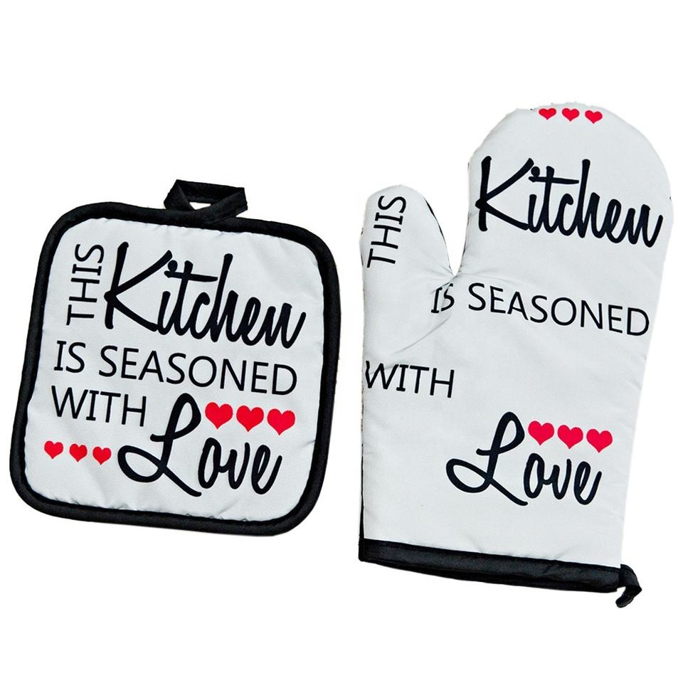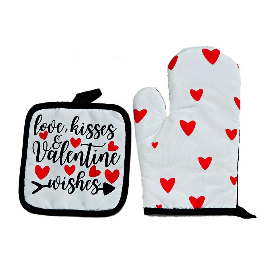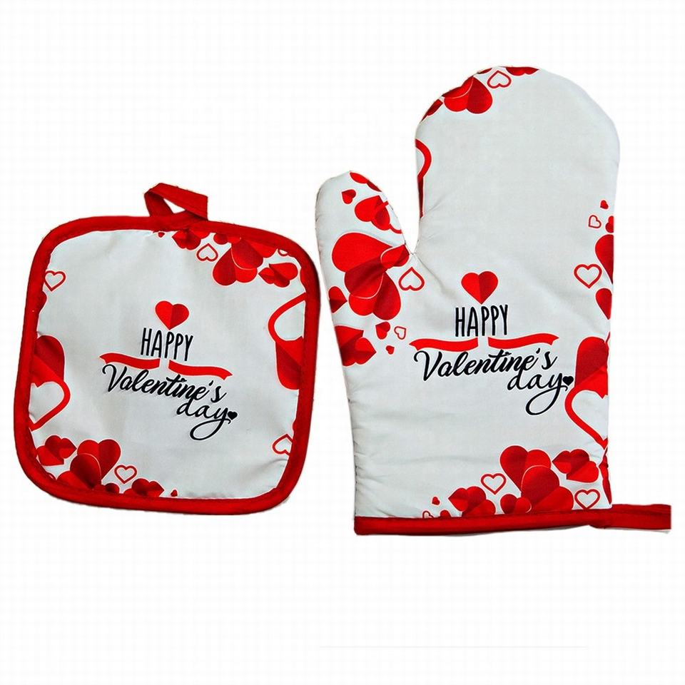 ชุดถุงมือกันความร้อนและที่รองหม้อสำหรับครัววันวาเลนไทน์ - ถุงมือปิ้งย่างบาร์บีคิวโพลีเอสเตอร์ที่เป็นมิตรกับสิ่งแวดล้อมและทนทาน