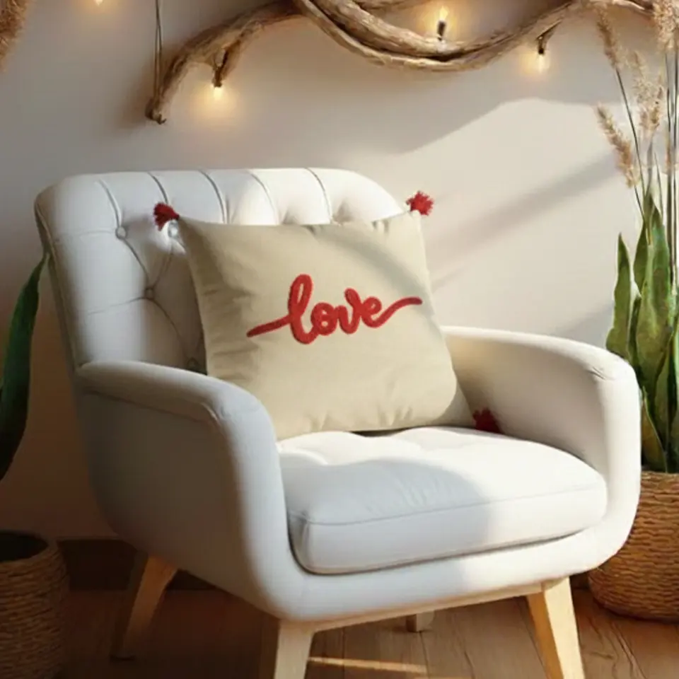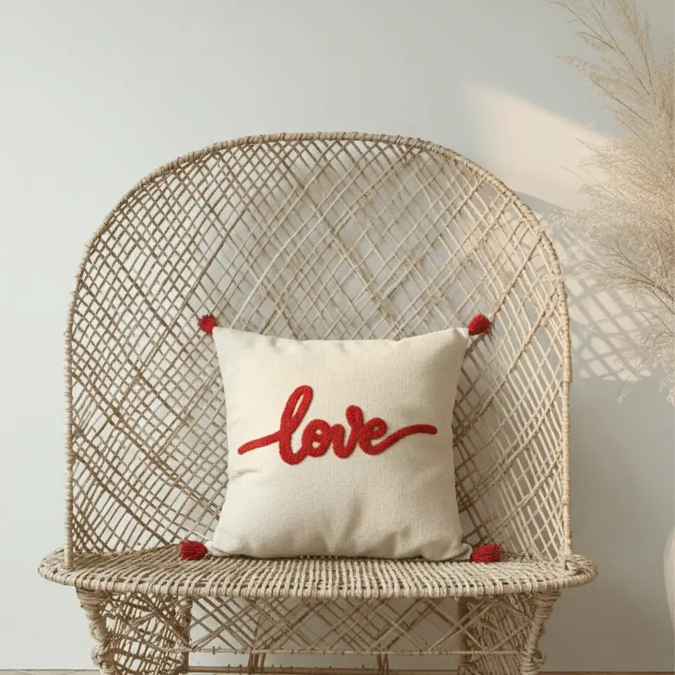ดีไซน์พิเศษวันวาเลนไทน์ 'Signature Love' หมอนอิงผ้าฝ้ายดั๊กทรงสี่เหลี่ยม 1 ชิ้น ปักลายรูปหัวใจสีแดง ทำด้วยมือ