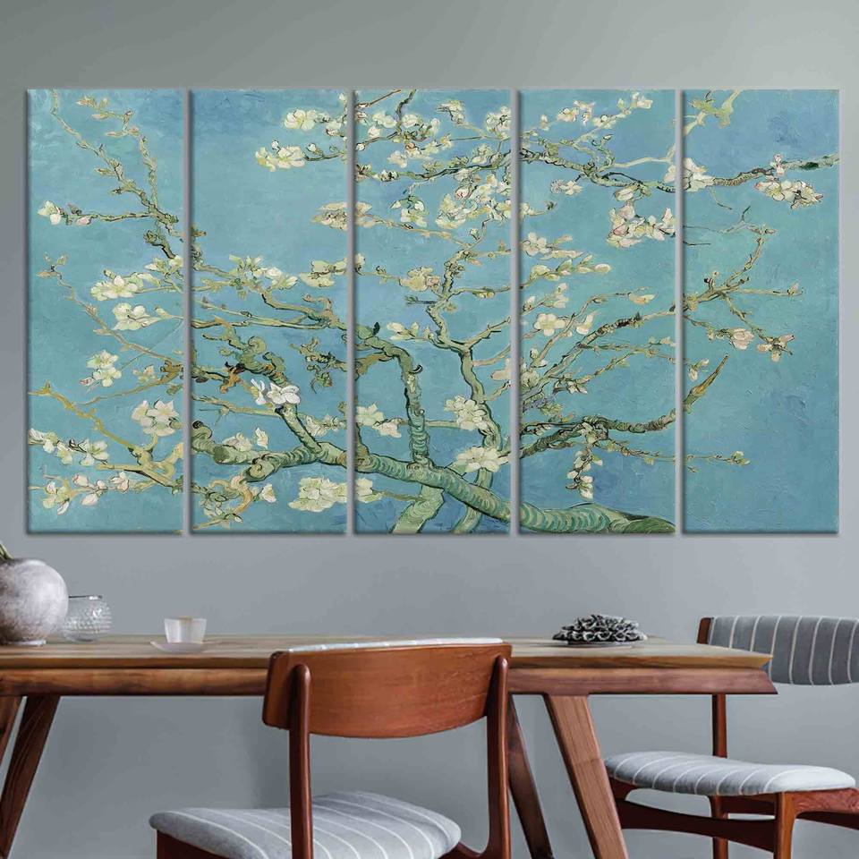 ภาพพิมพ์บนผ้าใบวานโก๊ะ ต้นอัลมอนด์: ภาพกิ่งก้านดอกบาน ชุดผ้าใบ 5 ชิ้น