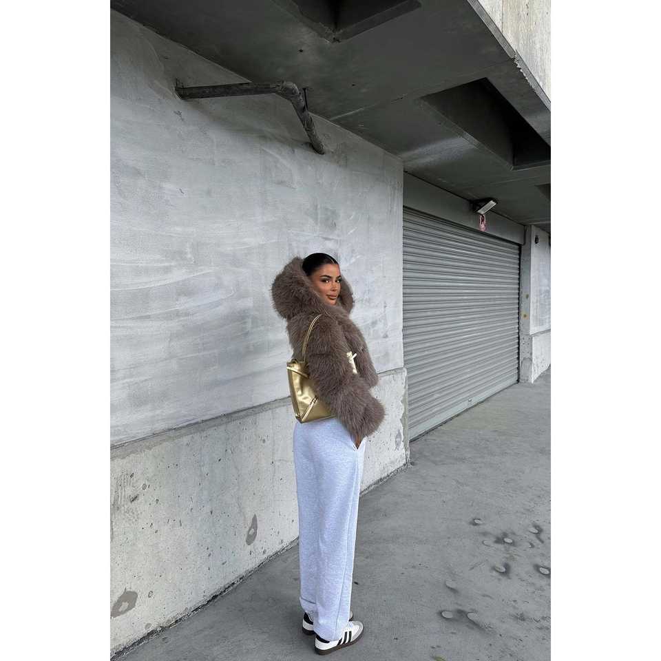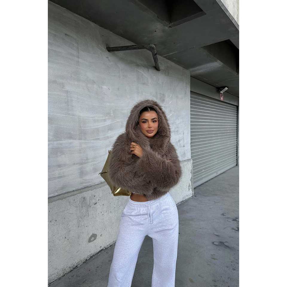 เสื้อโค้ทขนกระต่ายสีน้ำตาลของวาเนีย แบบมีฮู้ด ยาวคลุมทั้งตัว ติดกระดุมแถวเดียว ปิดด้วยซิป ลายเสือดาว ผ้าขนสัตว์ทอ ติดกระดุม