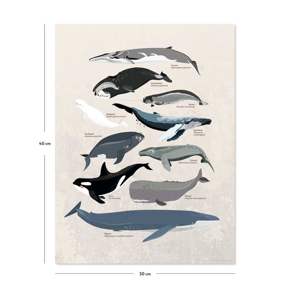 โปสเตอร์วาฬหลากหลายสายพันธุ์พร้อมกรอบสีดำสำหรับตกแต่งผนัง