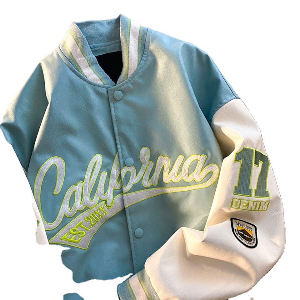 แจ็คเก็ตทีมเบสบอลคู่หนัง PU ใหม่สำหรับผู้ชายเสื้อโค้ทลำลองทรงหลวมพิมพ์ลายเสื้อบอมเบอร์