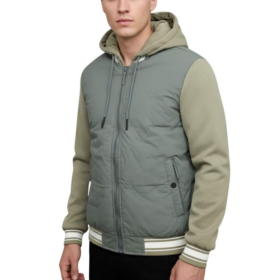 เสื้อแจ็คเก็ตพัฟเฟอร์สไตล์วาร์ซิตี้สำหรับผู้ชาย สีดำ เสื้อโค้ทบับเบิ้ล รับสกรีนโลโก้ เสื้อกันหนาวบุหนา สตรีทแวร์ แจ็คเก็ตมีฮู้ดให้ความอบอุ่น