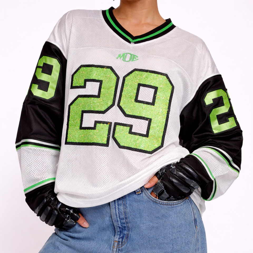 เสื้อเจอร์ซีย์อเมริกันฟุตบอลแบบวาร์ซิตี้ ผ้าตาข่ายระบายอากาศได้ดี สำหรับทุกเพศ ตัวเลขประดับเพชร แขนยาว สไตล์สตรีท รับผลิตแบบ OEM แบรนด์ส่วนตัว ขายส่ง