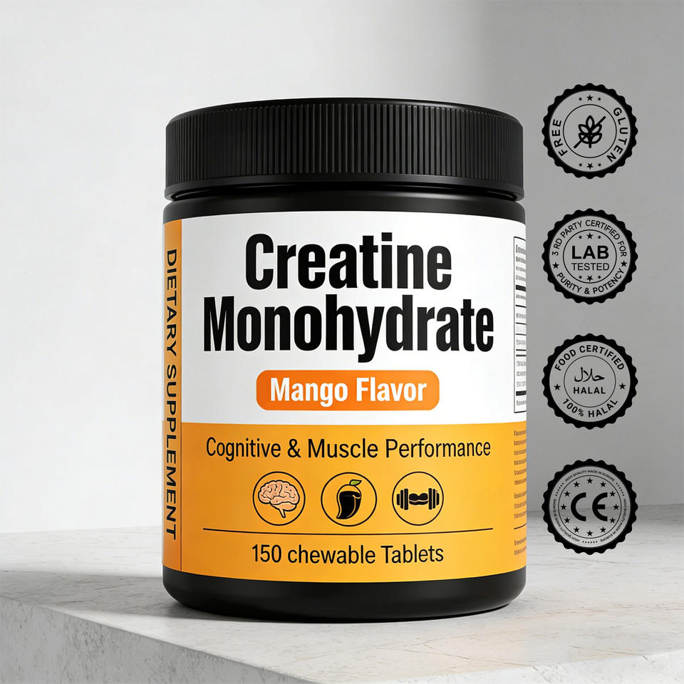 ครีเอทีนโมโนไฮเดรตแบบเคี้ยวสำหรับคนทานมังสวิรัติ ได้รับการรับรองมาตรฐาน GMP บริการพัฒนาแบรนด์ตามความต้องการ เครื่องดื่มเติมพลังงาน