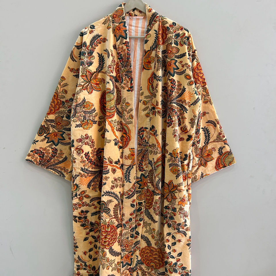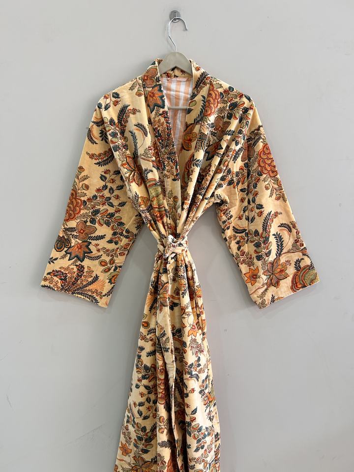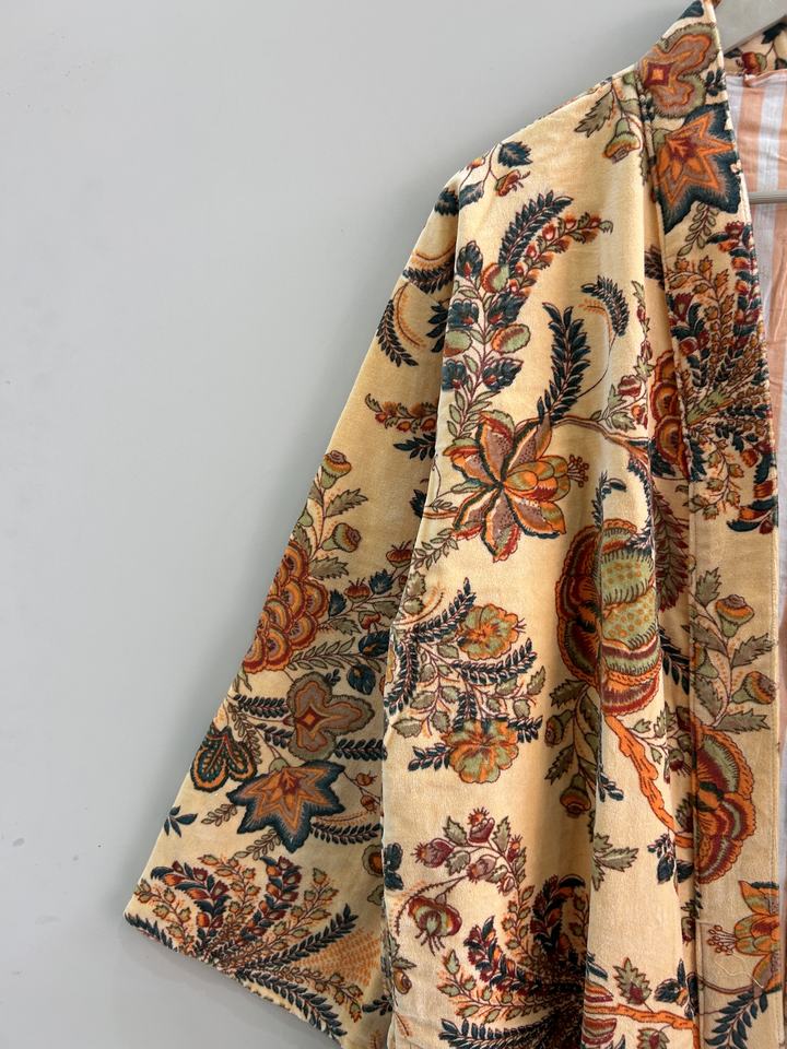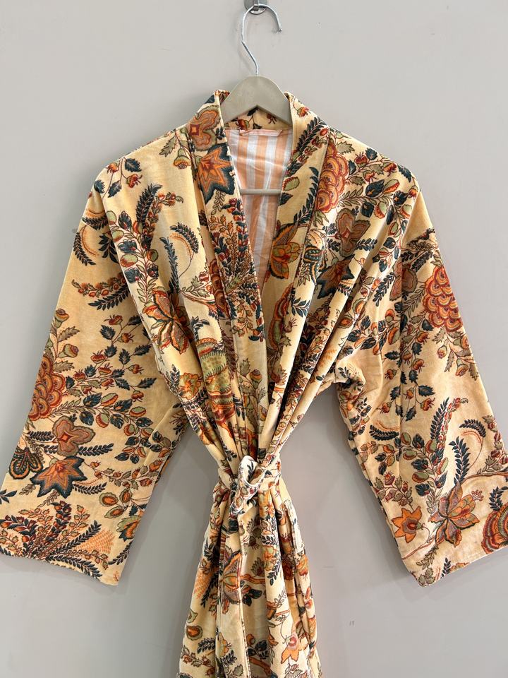 ชุดกิโมโนผ้ากำมะหยี่สำหรับผู้หญิง เสื้อคลุมยาวลายดอกไม้