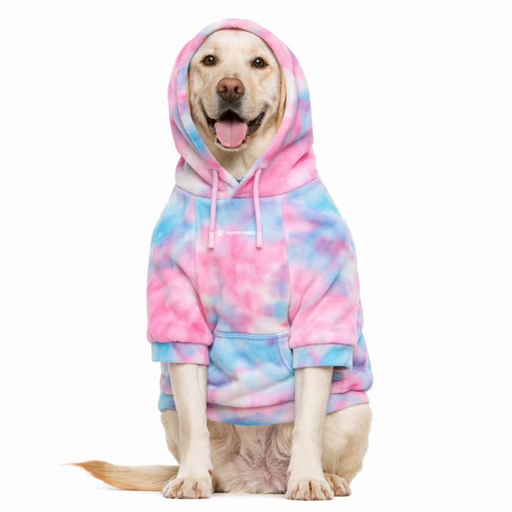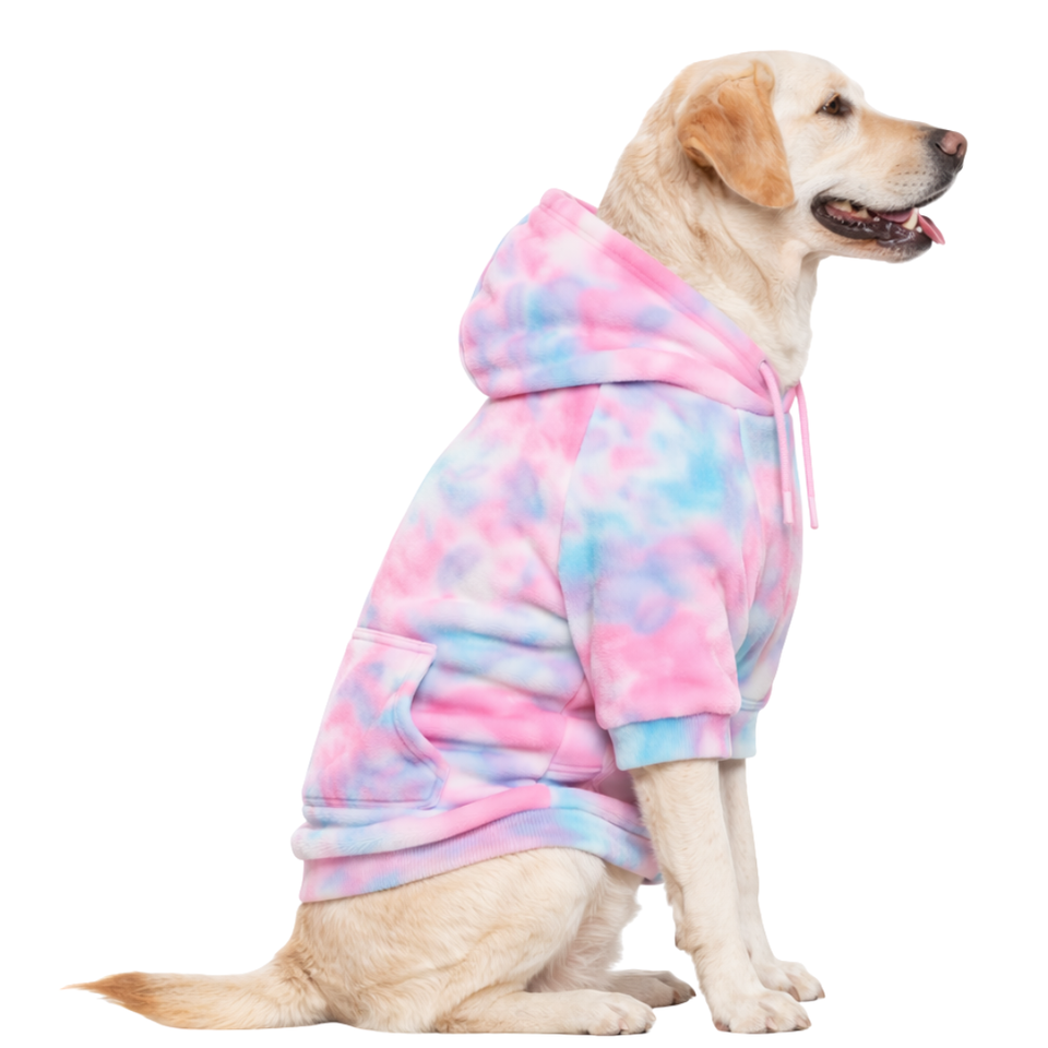 เสื้อฮู้ดดี้กำมะหยี่สำหรับสุนัข สีชมพู-ฟ้า ลายมัดย้อม เนื้อผ้านุ่ม ขนฟู สวมใส่สบาย อุ่นสบาย เหมาะสำหรับสุนัขขนาดกลางถึงใหญ่ ใส่ได้ในช่วงฤดูหนาว