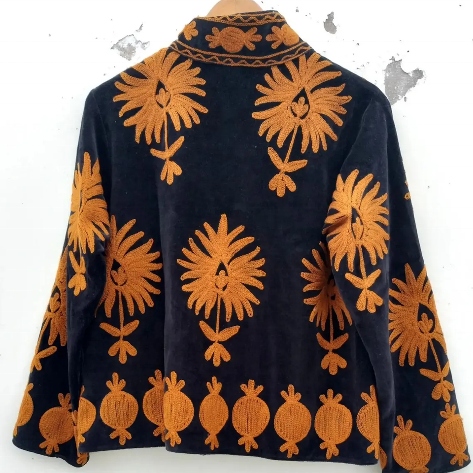 Suzani แจ็กเก็ตปักกำมะหยี่สำหรับผู้หญิงเสื้อคลุมกันฝุ่นโบฮีเมียนลายดอกไม้ปักลวดลายอย่างประณีต
