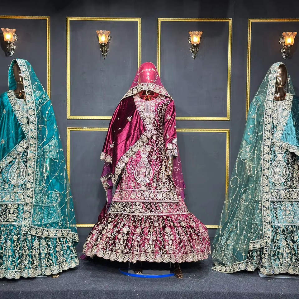 ชุดเจ้าสาวกำมะหยี่แบบฟาร์ซี พร้อมผ้าคลุมไหล่แบบหนาสองชั้น และงานประดับหินจาร์กันอย่างหรูหรา มีให้เลือก 7 สีสันสวยงามสำหรับงานแต่งงาน