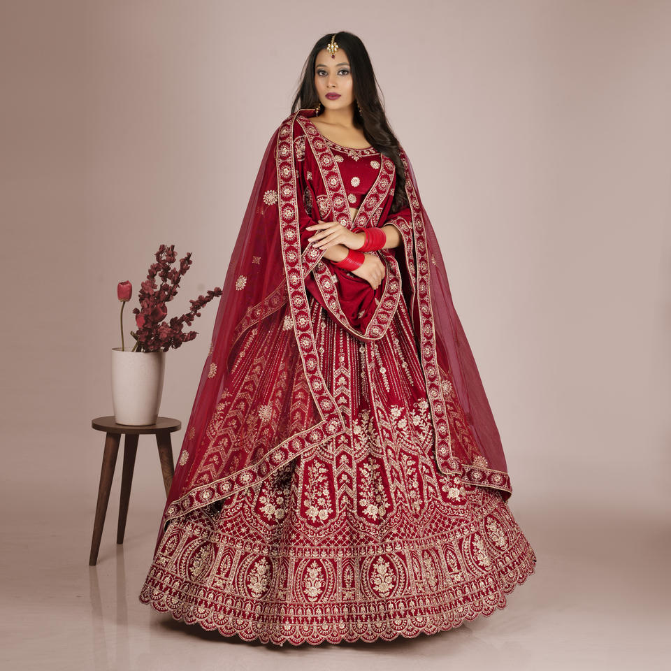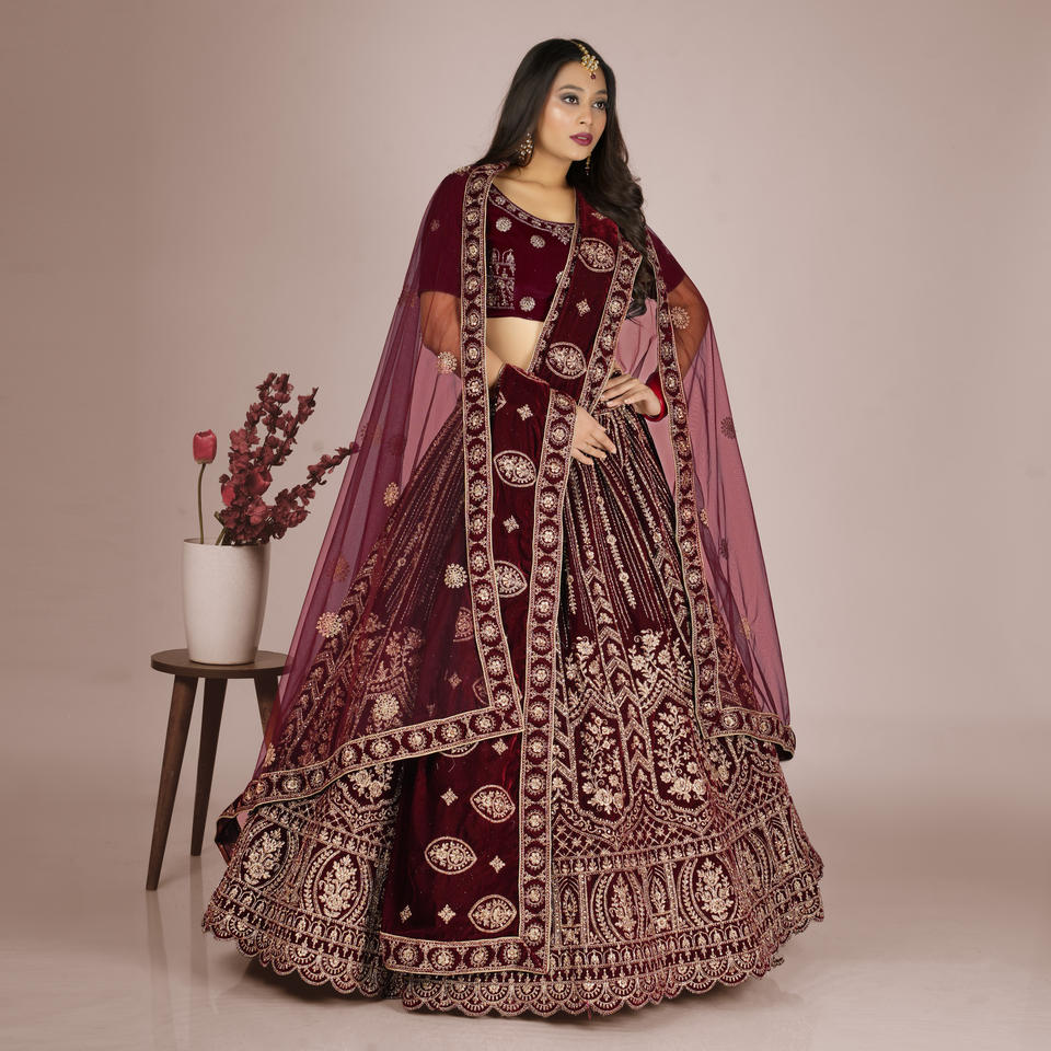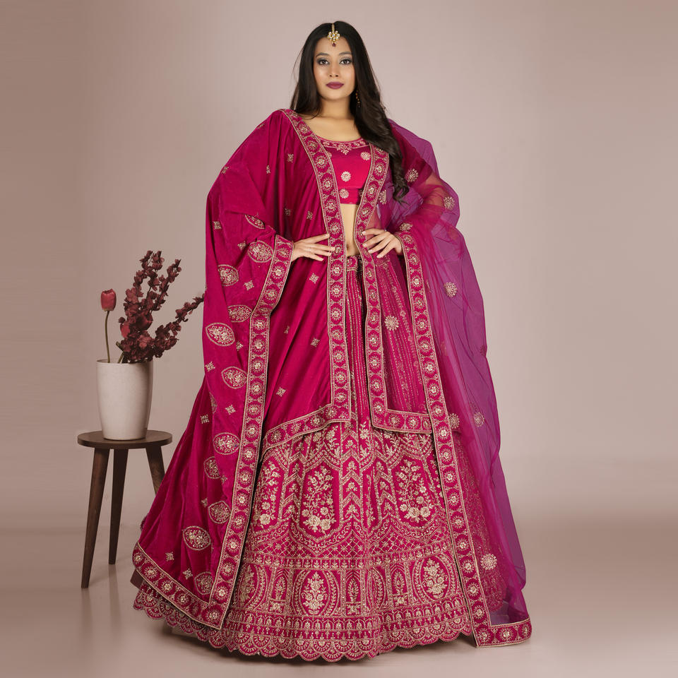 ชุดเลเฮนกาโชลีผ้ากำมะหยี่ พร้อมผ้าคลุมสองผืน ปักลายอย่างหรูหรา กระโปรงทรงบาน เสื้อเข้าชุด ผ้าเน็ตเนื้อนุ่ม แต่งผ้าคลุม-สไตล์บอลลีวูด สำหรับงานแต่งงานและงานดิวาลี