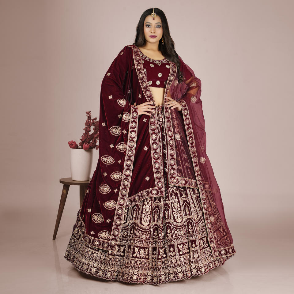 ชุดเลเฮนกาโชลีผ้ากำมะหยี่ปักลายหนัก กระโปรงทรงบานสำหรับเจ้าสาว เสื้อดีไซเนอร์ ผ้าคลุมไหล่หรูหรา สไตล์บอลลีวูด สำหรับงานปาร์ตี้และงานแต่งงาน