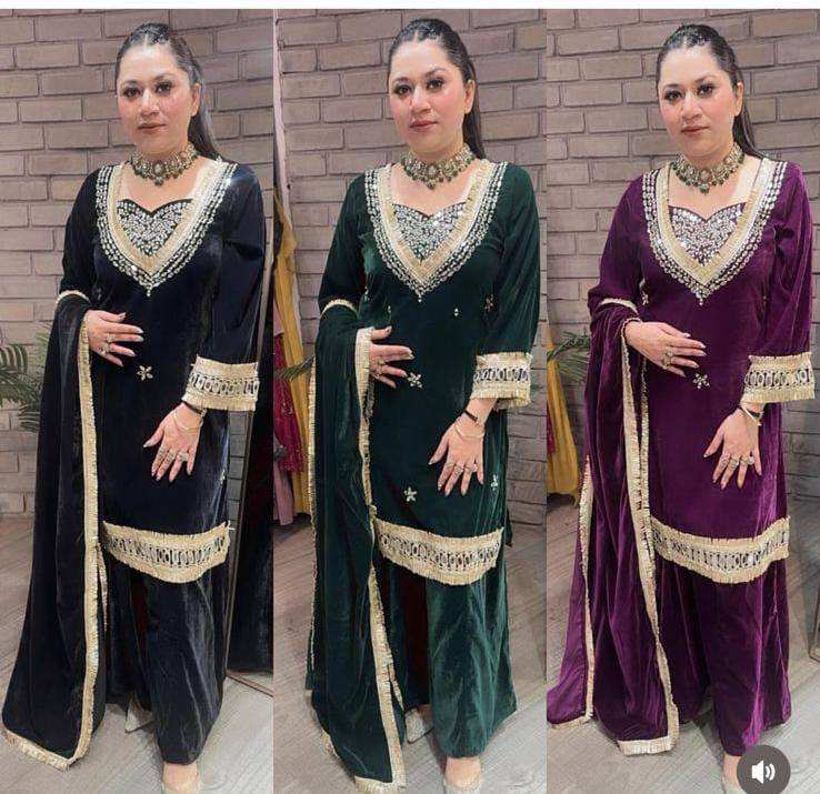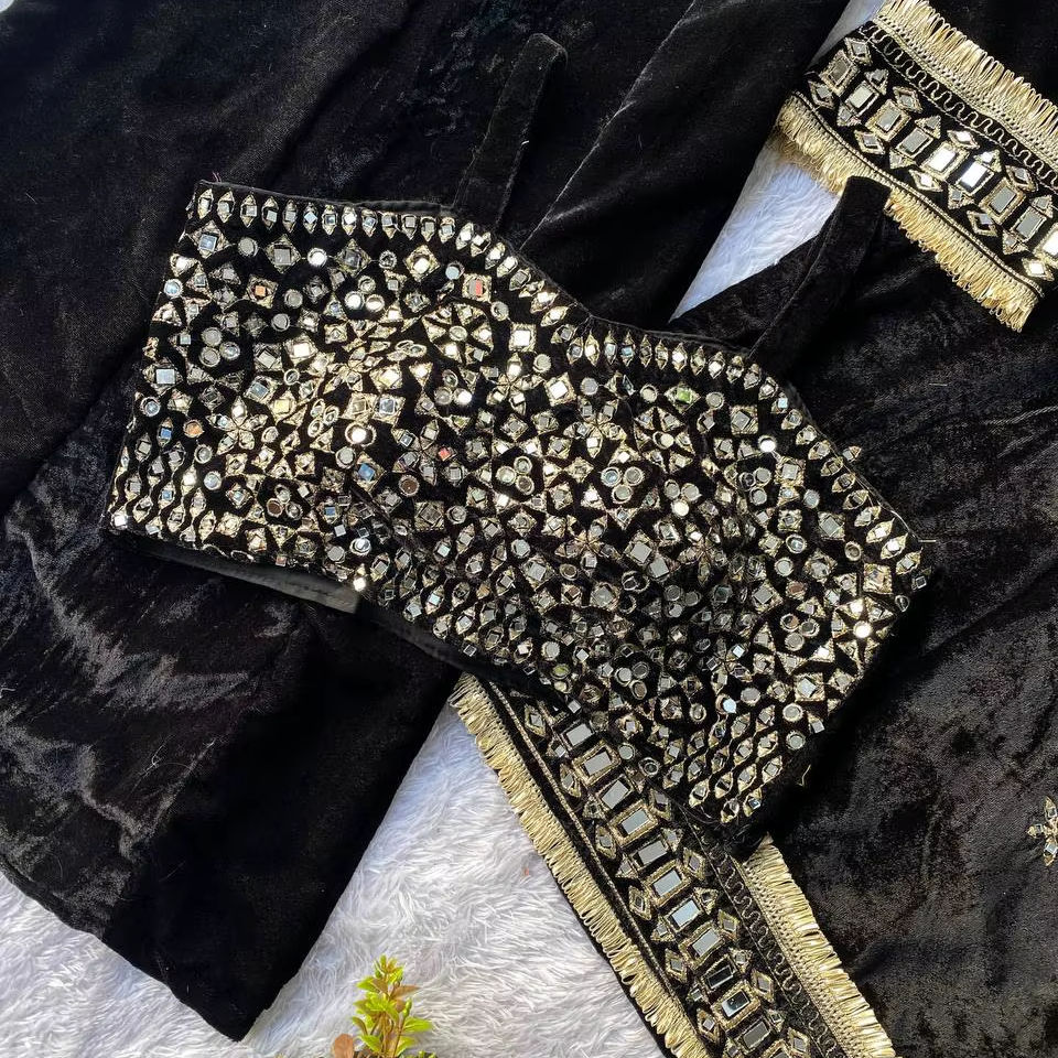 Velvet Mirror Work Plazzo Suit Set with Embroidery Blouse and Lace Border Dupatta Ethnic Winter Wear Party Salwar Kameez Outfit