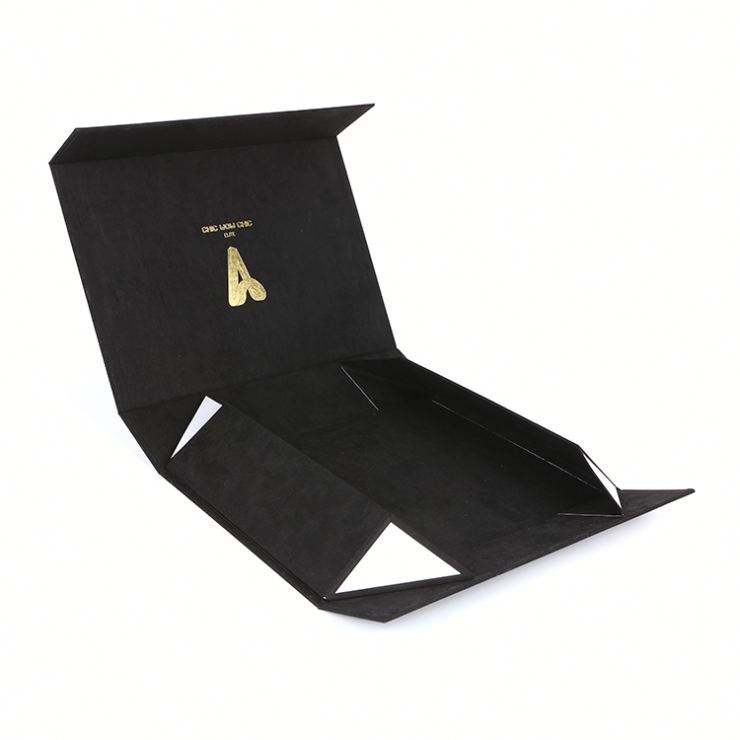 บรรจุภัณฑ์กระดาษแข็งกำมะหยี่กล่องพับได้แบบกำหนดเองพลิกฟอยล์สีทองด้านปิดแม่เหล็กสีดำเคลือบเงา