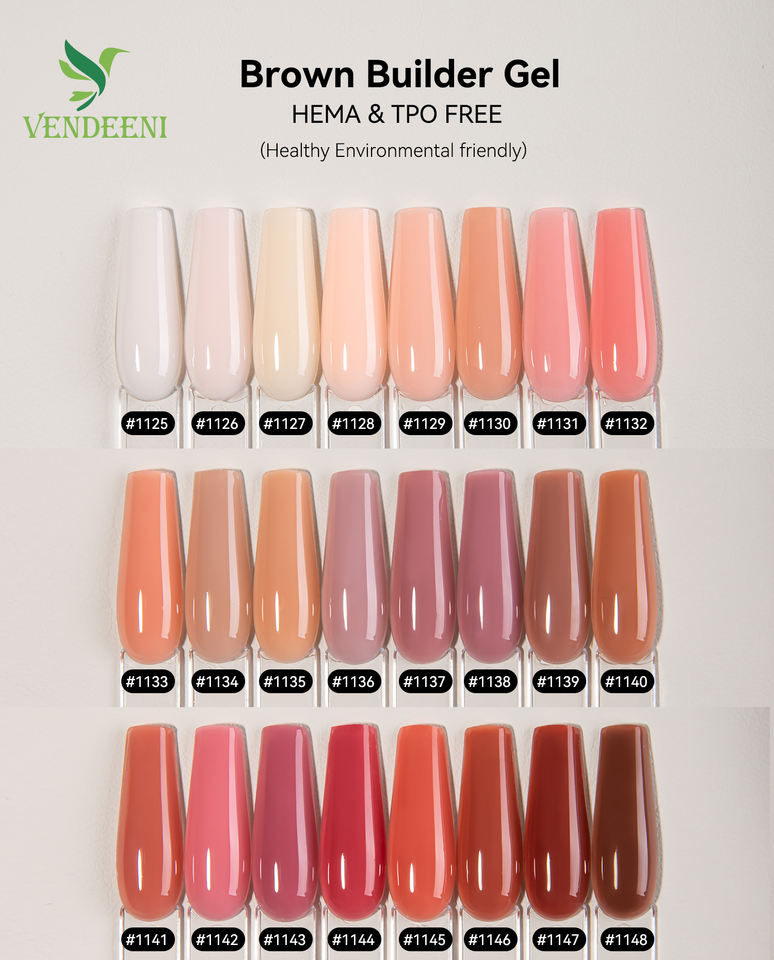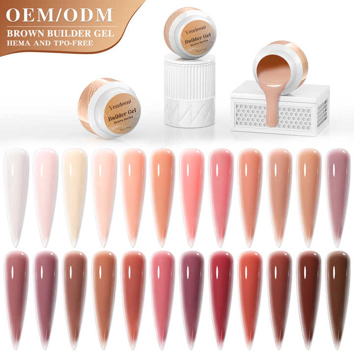 เจลต่อเล็บ Vendeeni ODM สีน้ำตาล 24 สี เจลอะคริลิค โพลีเจล TPO ปราศจากสาร HEMA OEM 20 กรัม เจลยูวีเนื้อแข็งสำหรับต่อเล็บ