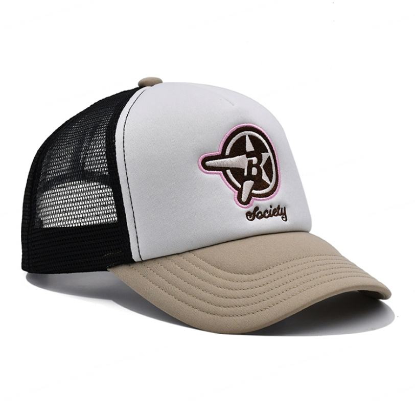 หมวกทรูเกอร์ผู้ชายปักโลโก้5แผงหมวกผ้าตาข่ายโฟมออกแบบได้ตามต้องการ