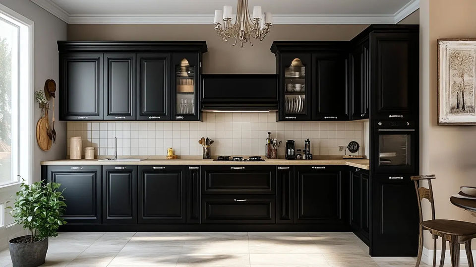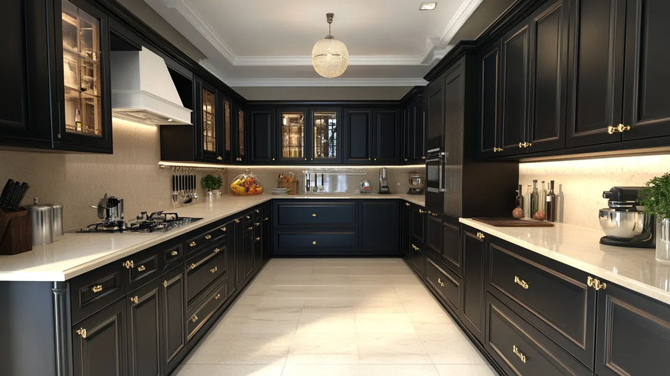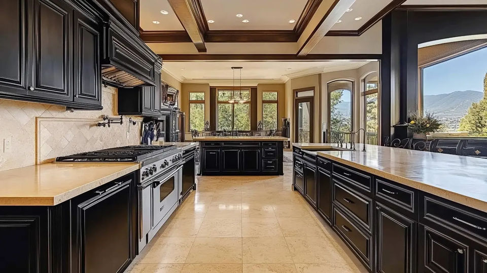 ตู้ครัวเวอร์มอนเฮาส์ประสิทธิภาพสูงสีดำ พร้อมมือจับสีทอง ทนความร้อน เหมาะสำหรับสภาพแวดล้อมครัวระดับมืออาชีพ