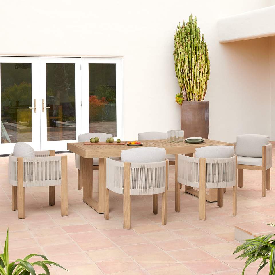 ชุดโต๊ะรับประทานอาหารในสวน Verrel Simple ทำจากโครงไม้สักแท้ พร้อมเก้าอี้หวายถัก และพื้นผิวแบบธรรมชาติ สำหรับใช้งานกลางแจ้ง