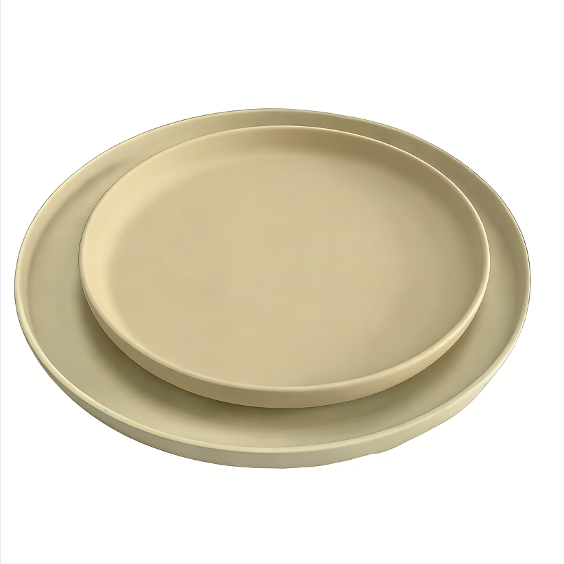 ชุดจานอาหารเมลามีนทรงกลมสีเบจ 2 ชิ้นอเนกประสงค์ สำหรับอาหารเรียกน้ำย่อย ของหวาน และอาหารจานหลัก
