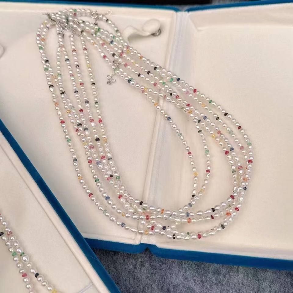 สร้อยคอมุกน้ำจืดอเนกประสงค์ 3-4 มม. หรูหราเรียบง่าย พร้อมคริสตัลหลากสีสัน หวาน เย็น สนุกสนาน