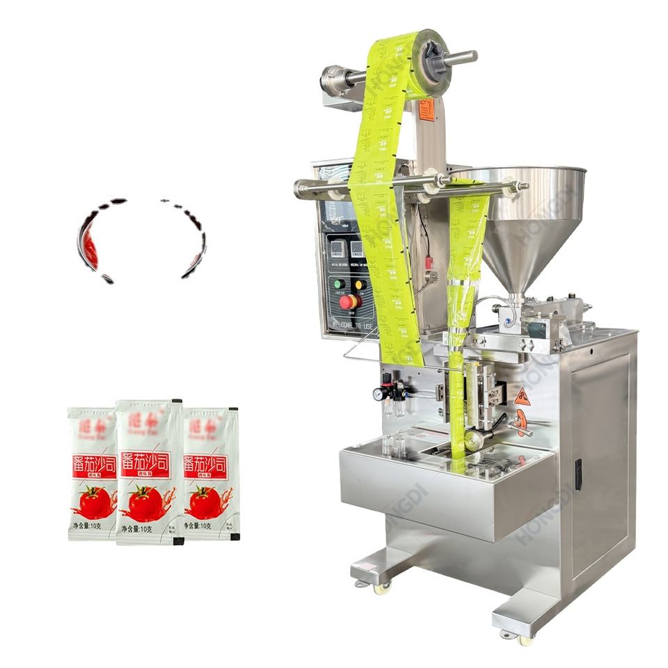 เครื่องบรรจุของเหลวแบบม้วนฟิล์มแนวตั้งใช้สำหรับบรรจุน้ำสลัด ซอสเนยถั่ว และซอสเนื้อวัว