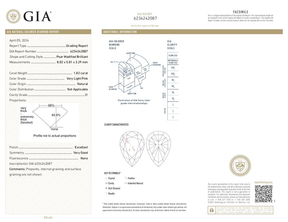 สีชมพูอ่อนมาก100% 1.02กะรัตเพชรธรรมชาติ I1กะรัตตัดเป็นลูกแพร์ของแท้ทรงหลวมประดับเพชรหรูหราได้รับการรับรองจาก Gia