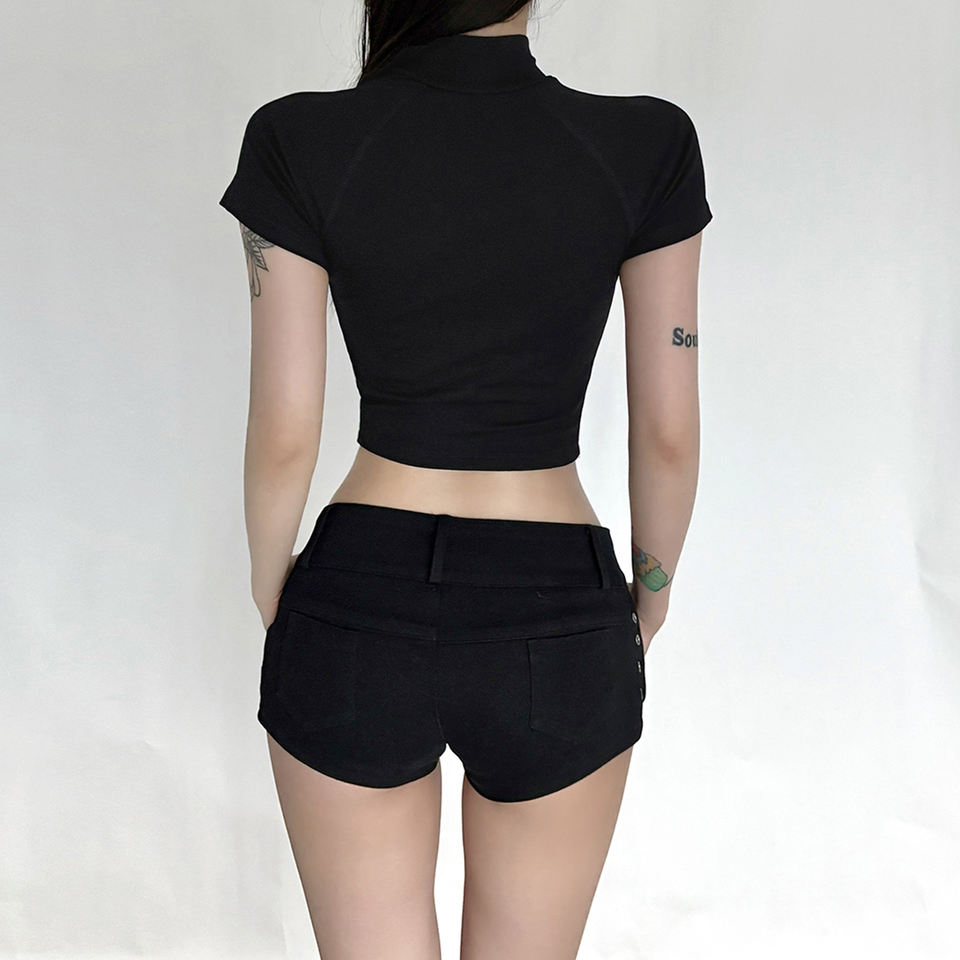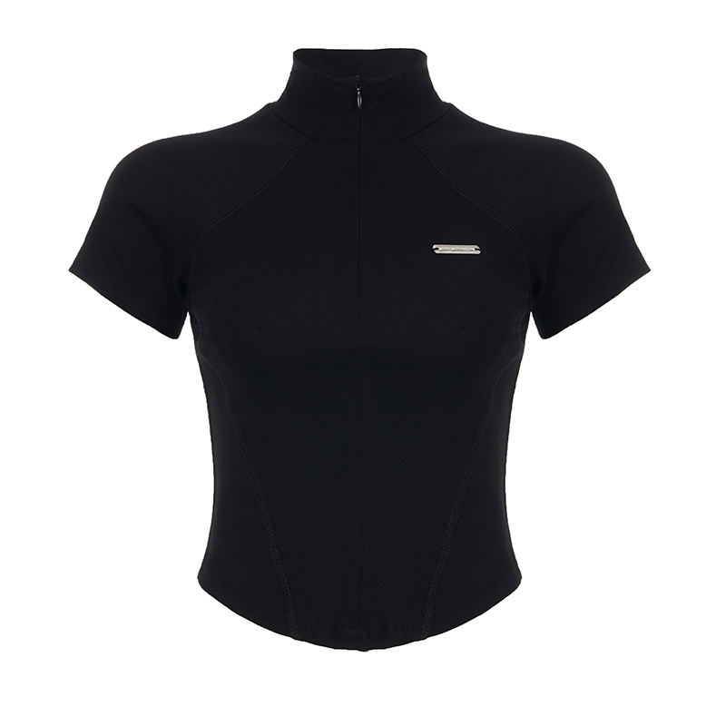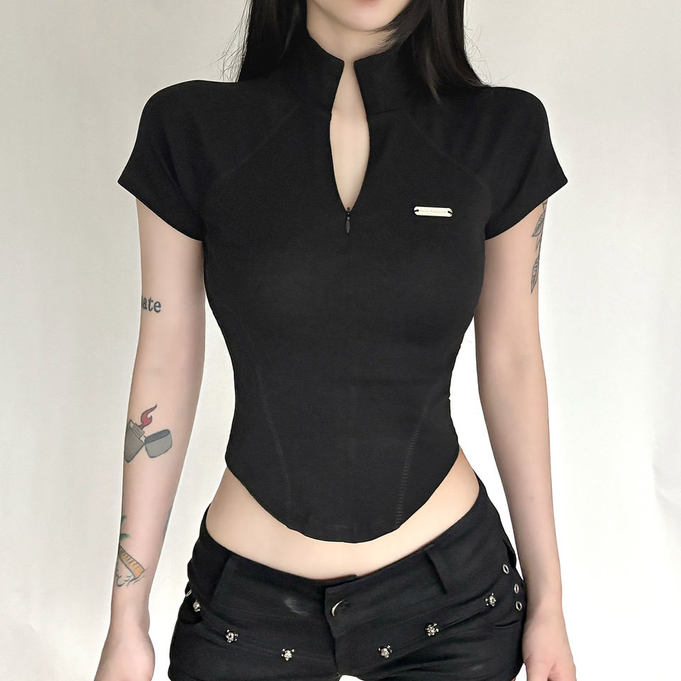 Vetements เสื้อยืดแขนสั้นทรงสลิมฟิตคอปกตั้งมีซิปแบบกอธิคสำหรับผู้หญิง Y2K