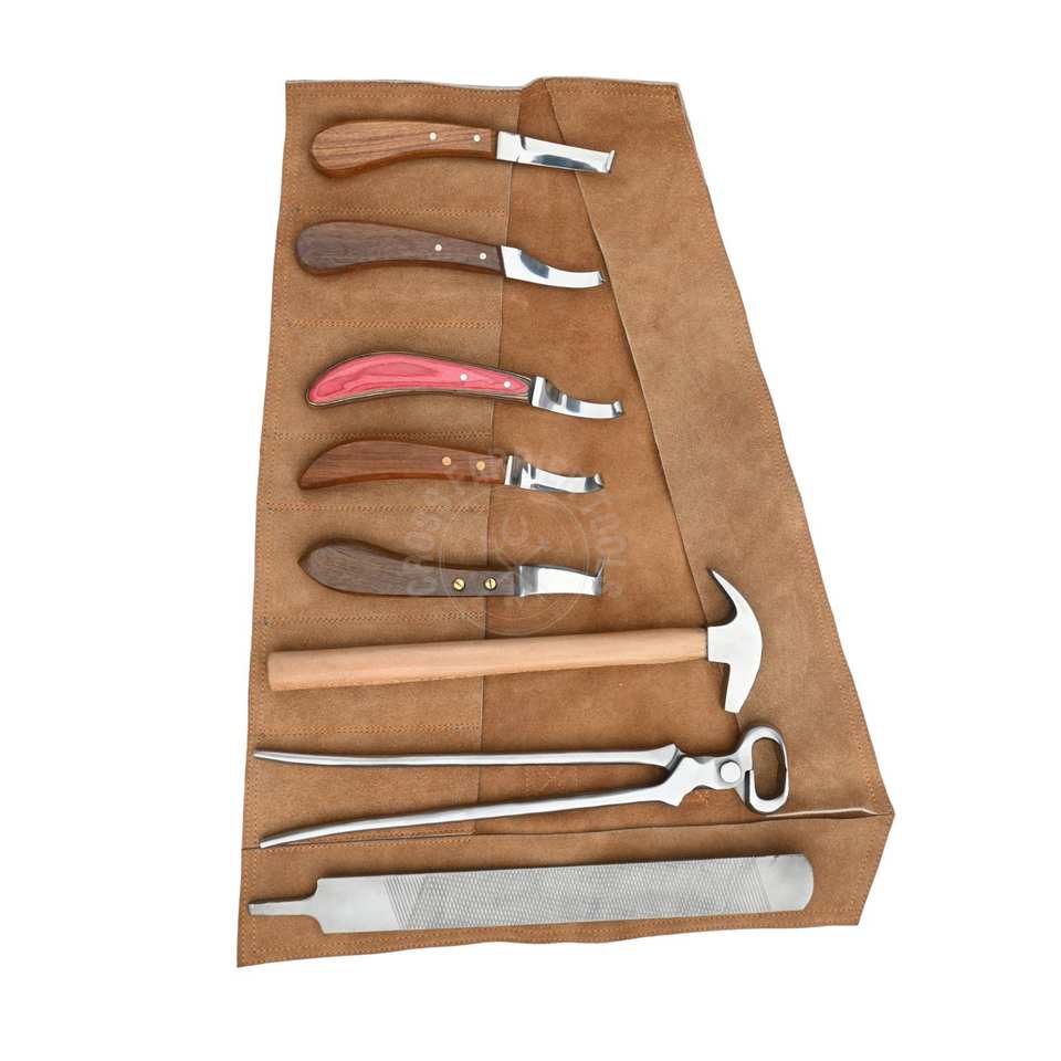 ชุดเครื่องมือช่างเกือกม้า ชุดมีดตัดแต่งกีบม้า คีมตัดกีบม้า ตะไบกีบม้า ค้อนตัดแต่งกีบม้า และม้วนเก็บเครื่องมือสำหรับม้า