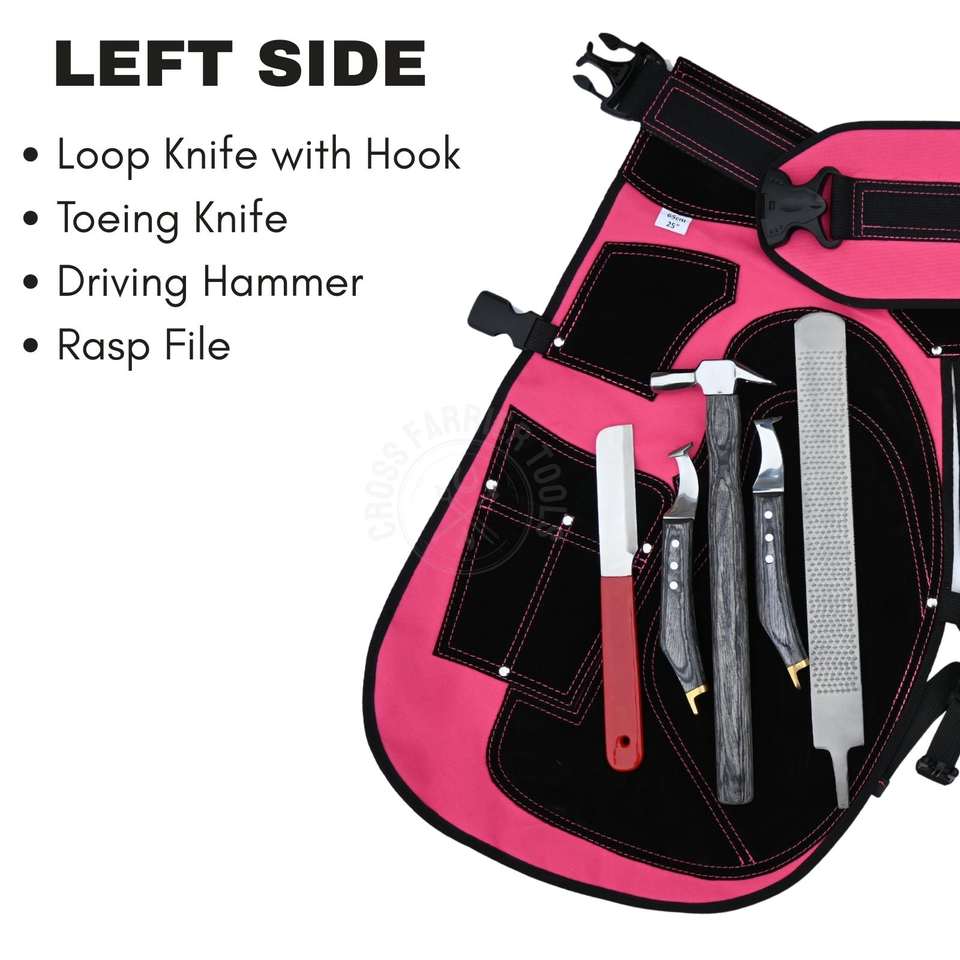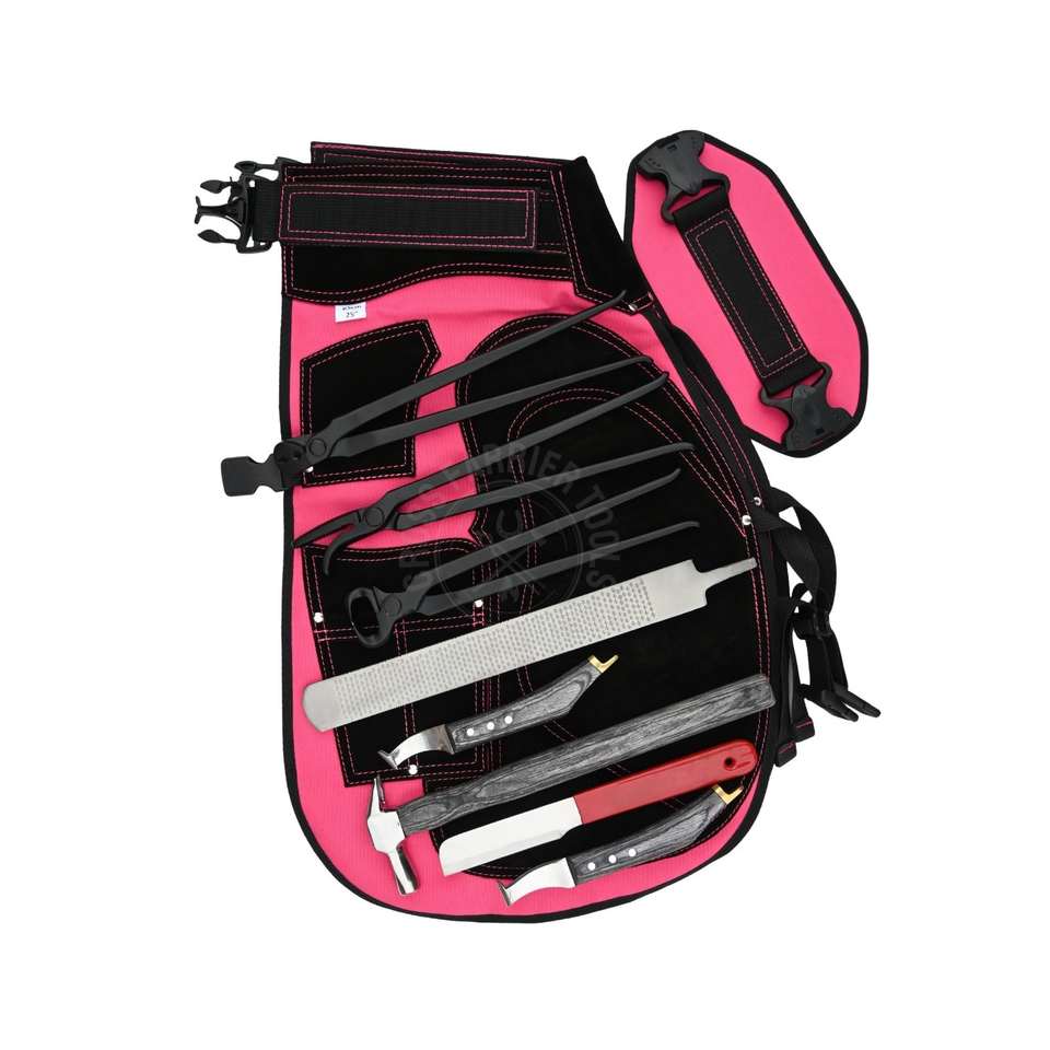 สไตล์:ชุดเครื่องมือช่างเกือกม้าล่าสุด พร้อมผ้ากันเปื้อนสีชมพู คีมตัดกีบ และที่ถอนตะปู