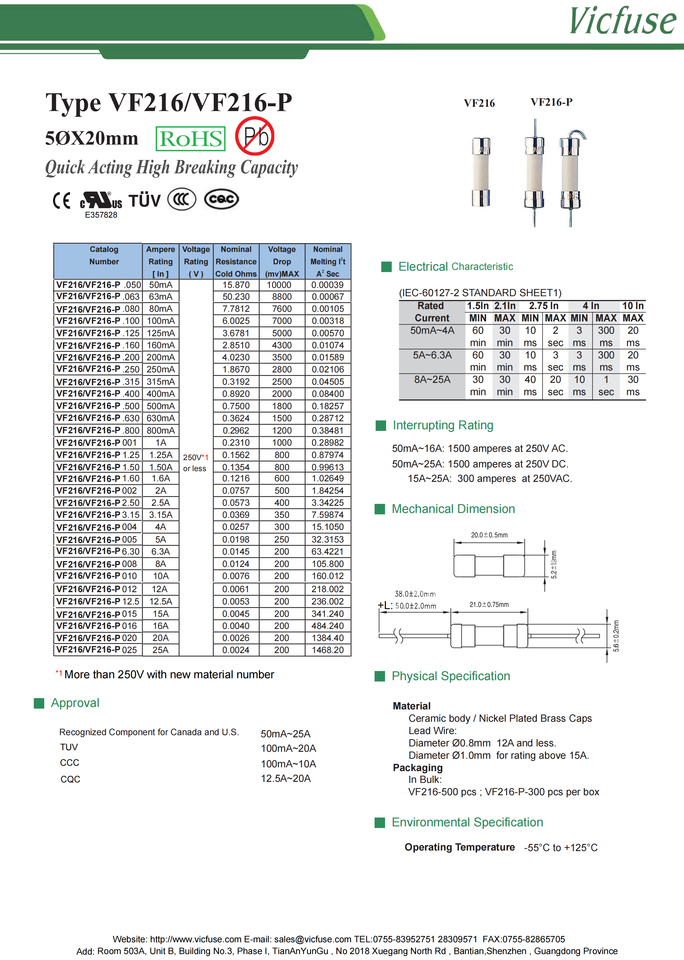 ฟิวส์เซรามิกแบบแท่ง Vf216/Vf216-P สำหรับรถยนต์ ยี่ห้อ VICFUSE ความจุสูง ทำงานเร็ว มาตรฐาน CE