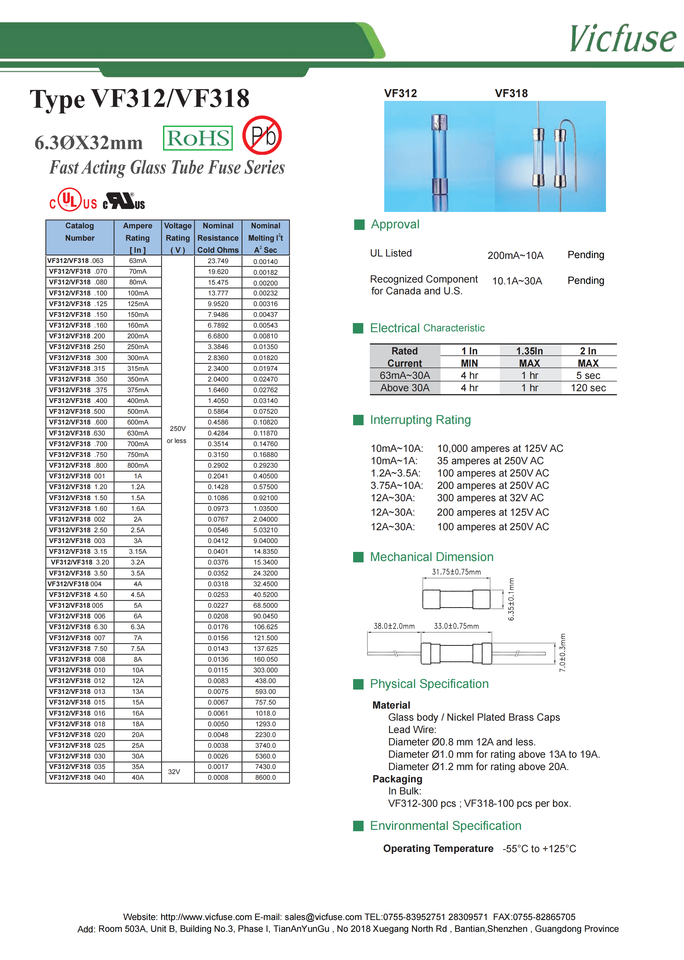 VICFUSE VF312/VF318 6.3*32mm 32V 250V Fast Acting Glass Tube Cartridge Fuses CE//CUL Certified for Cars