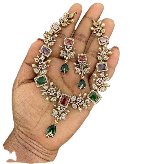 ชุดสร้อยคอรูปดอกไม้ประดับคริสตัลหลากสีสันสไตล์นาวรัตน์แบบอัฟกัน ประดับมรกต ทับทิม และอเมทิสต์