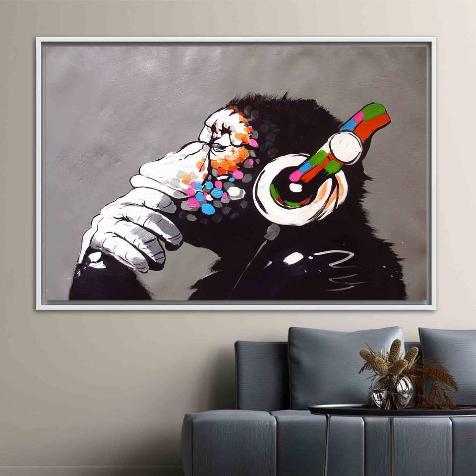 ศิลปะกราฟฟิตี้ลิงแบงก์ซี่สีสันสดใส - ภาพพิมพ์บนผ้าใบสำหรับตกแต่งสไตล์เมือง,1P:กรอบสีขาว