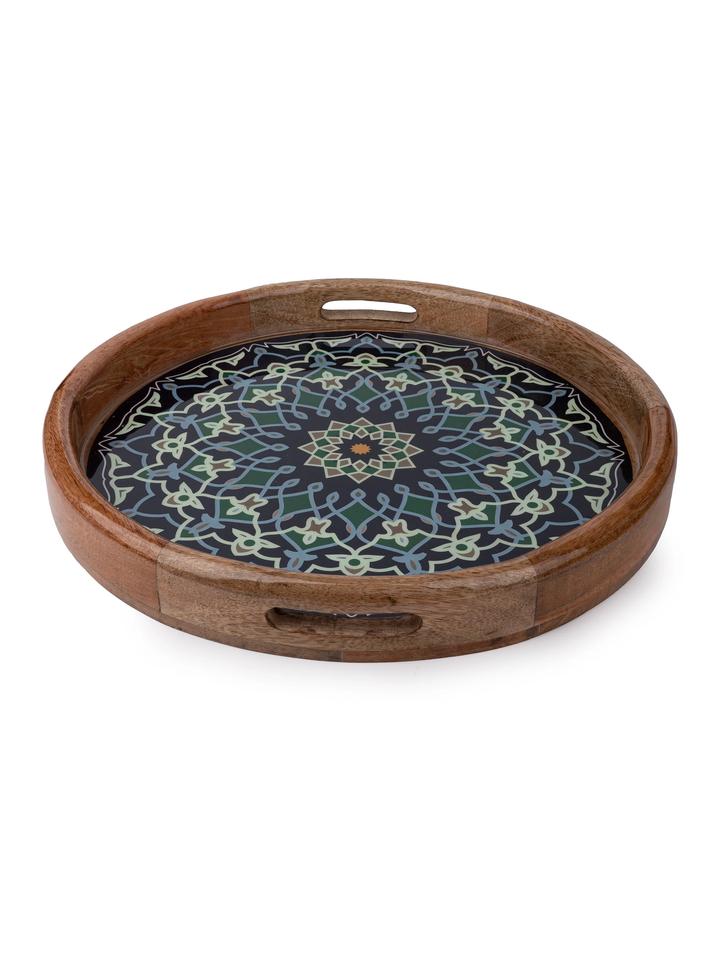 ถาดเสิร์ฟไม้แมนดาลาทรงเรขาคณิตสดใสจานสีสดใสดีไซน์ลายดอกไม้ที่ซับซ้อนทำด้วยมือ