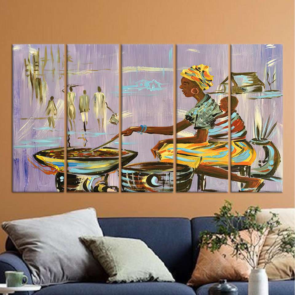 ของตกแต่งผนังสไตล์ไนจีเรียที่มีสีสันสดใส - งานศิลปะบนผ้าใบพิมพ์ลายสำหรับบ้าน ชุดผ้าใบ 5 ชิ้น