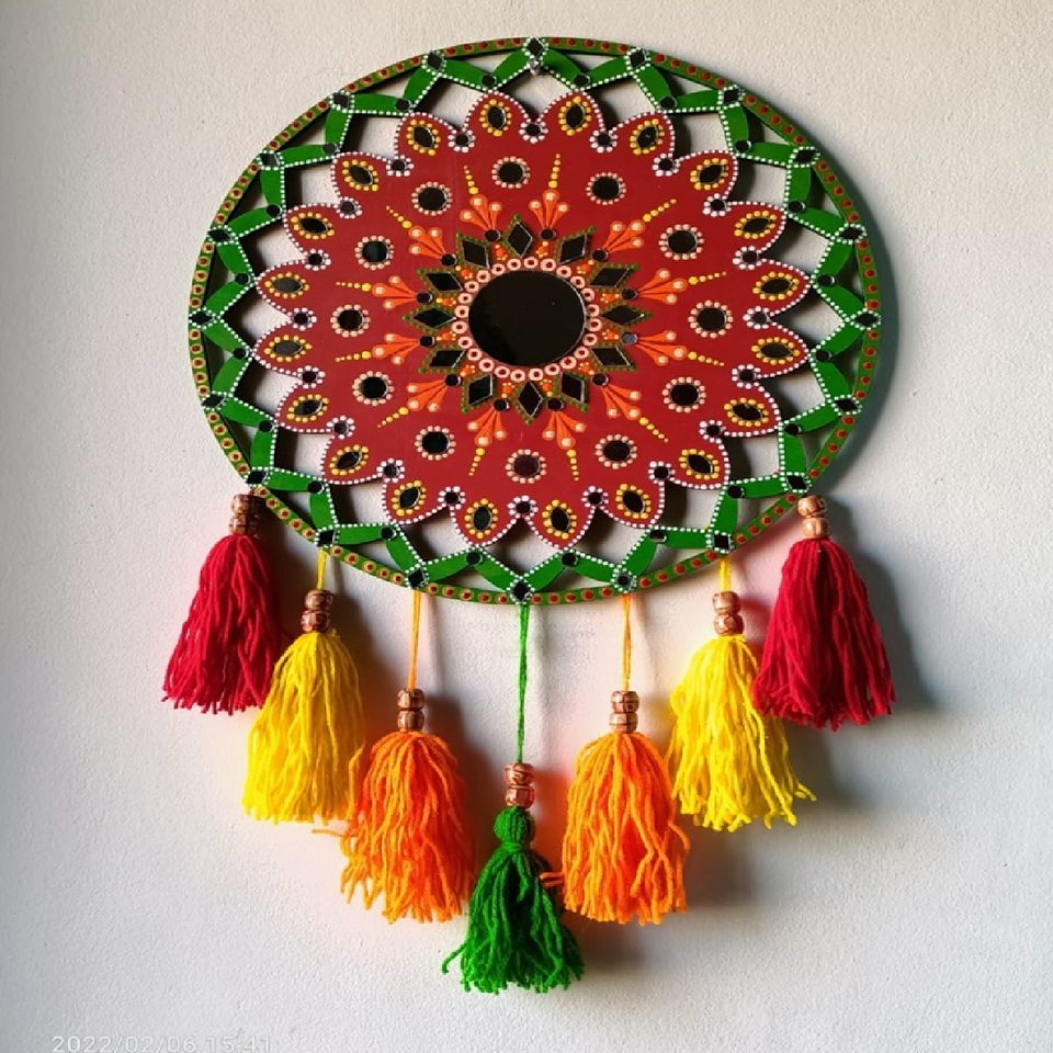 เครื่องดักความฝันแมนดาลาทาสีสดใสตกแต่งพู่แขวนผนังศิลปะสไตล์อินเดียสำหรับห้องนอน