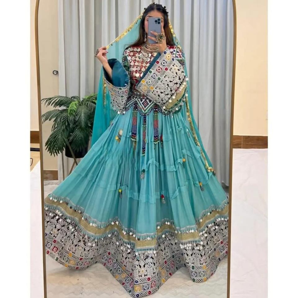 ชุดเดรสแบบดั้งเดิมของอัฟกานิสถานสีเทอร์ควอยส์สดใสมีกระจกปักหลากสีที่สลับซับซ้อนกระโปรงทำงานเป็นชั้น