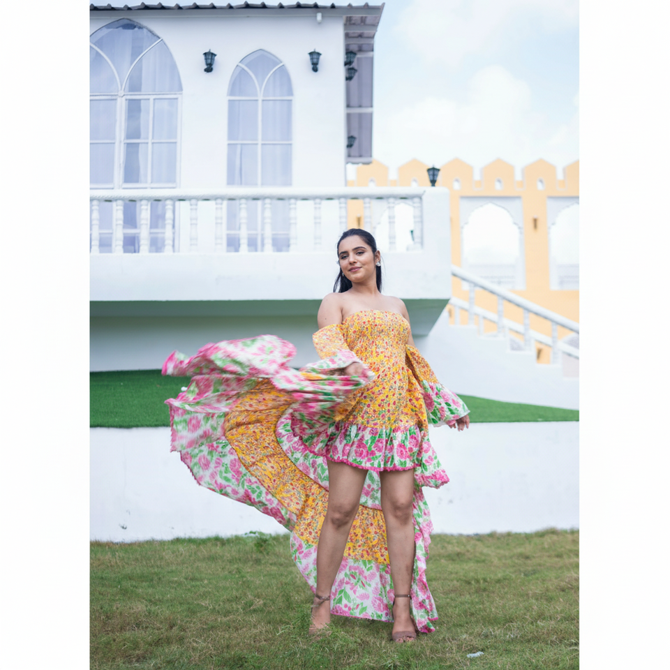 ชุดเดรสสีเหลืองสดใส ลายดอกไม้ ทรงไฮโลว์ แบบเปิดไหล่ แขนกระดิ่ง สไตล์โบฮีเมียน ชุดเดรสฤดูร้อนสำหรับงานเทศกาล พร้อมระบาย