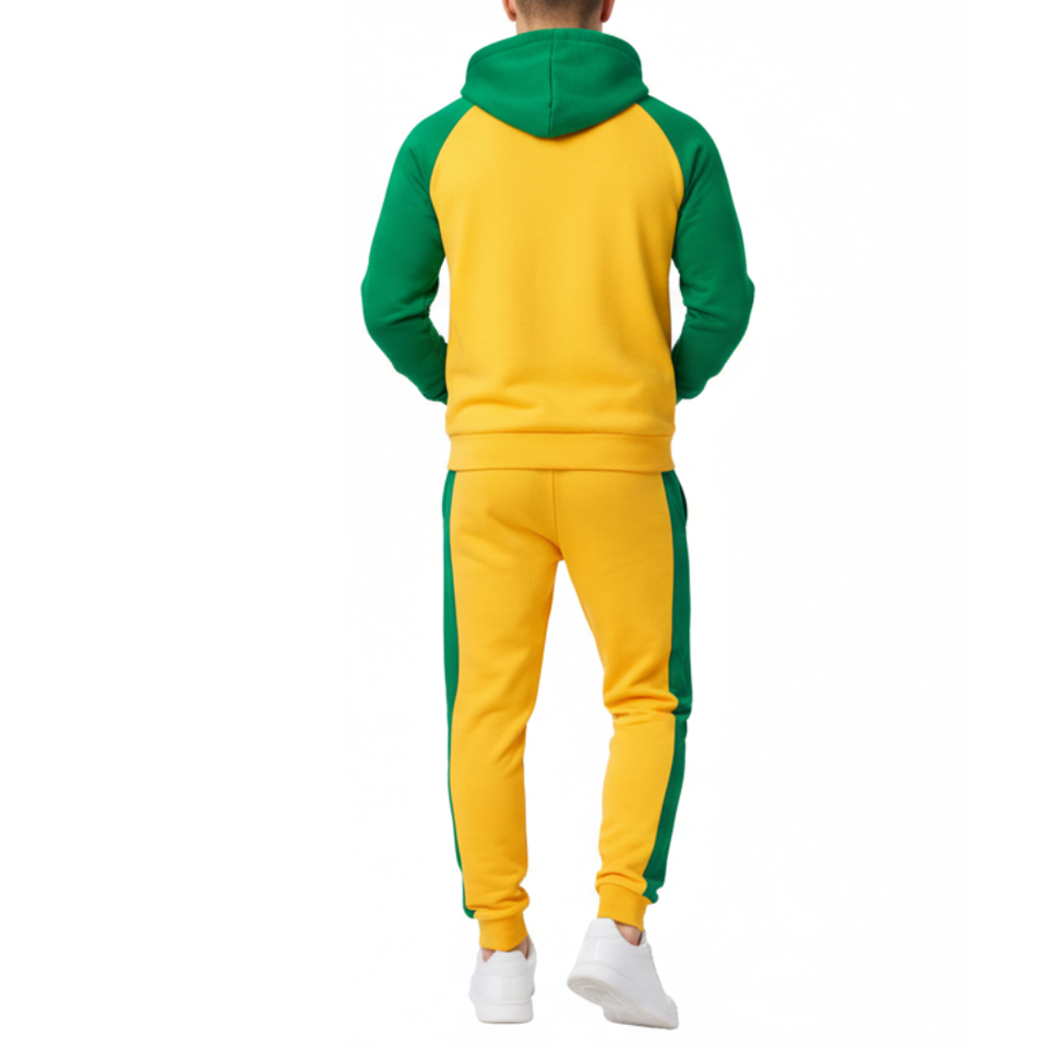 ชุดวอร์มผู้ชายสีเหลืองและเขียวสดใส | เสื้อฮู้ดแขนยาวแบบแร็กแลนพร้อมกางเกงขายาวลายแถบสีเขียวตัดกัน | ชุดกีฬาสองสี