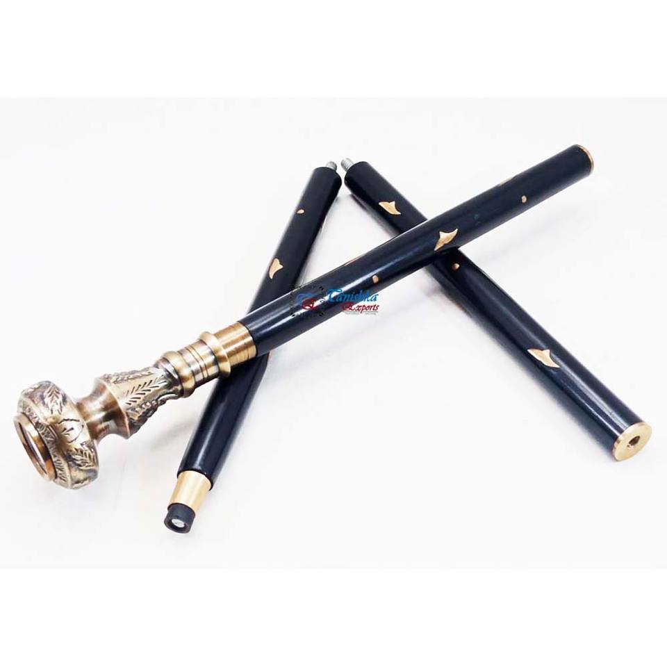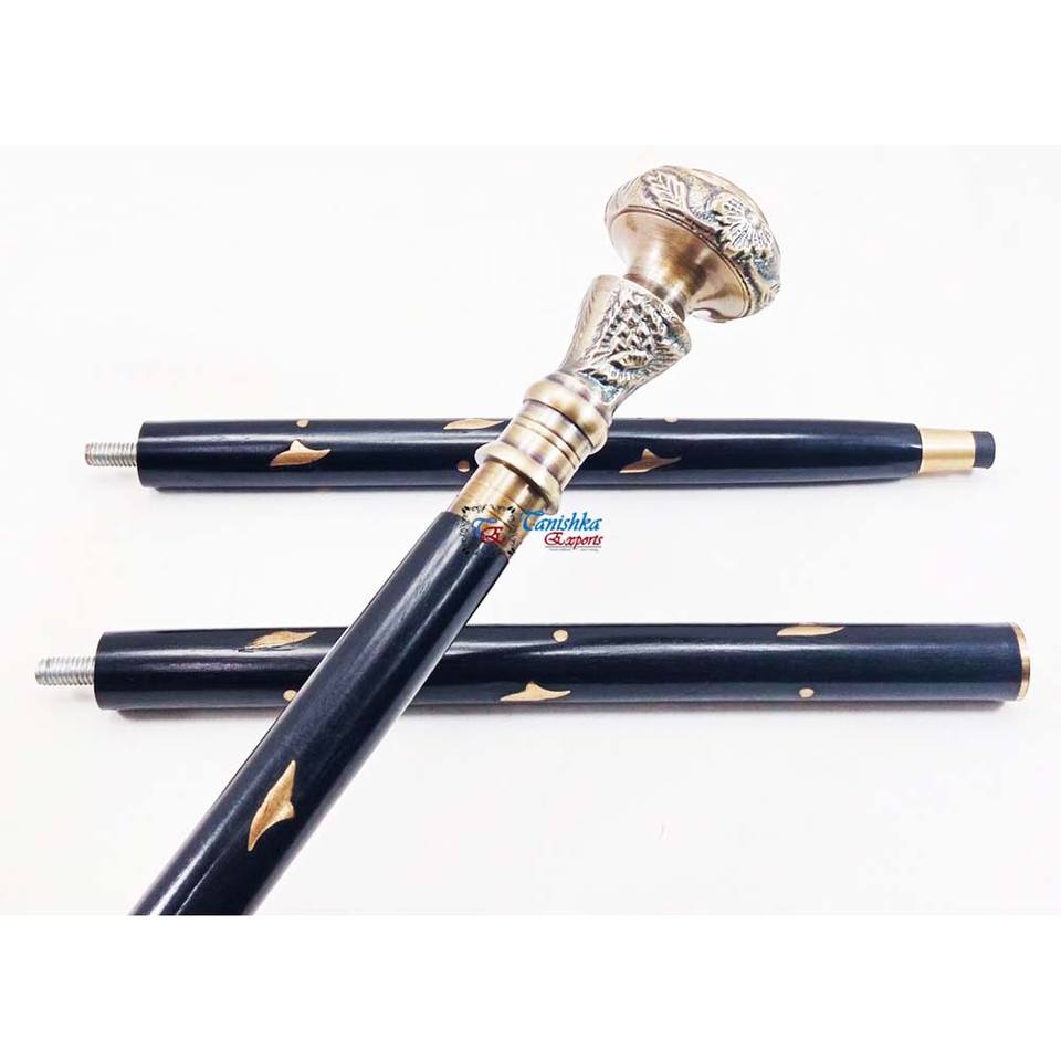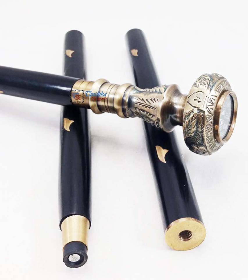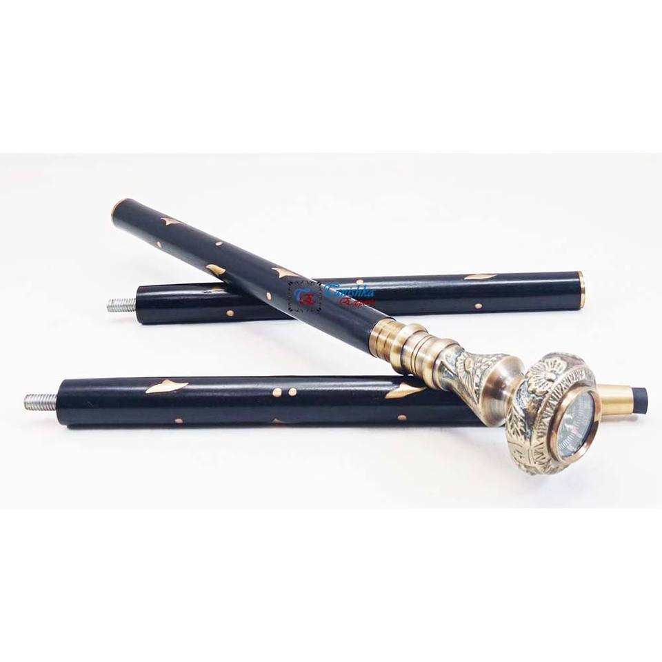 ไม้เท้าพับได้ปรับระดับได้สีดำ ยี่ห้อ Tanishka สำหรับขายส่ง พร้อมหัวทองเหลืองโบราณ ด้ามจับแบบเข็มทิศ ดีไซน์อาร์ตเดโค