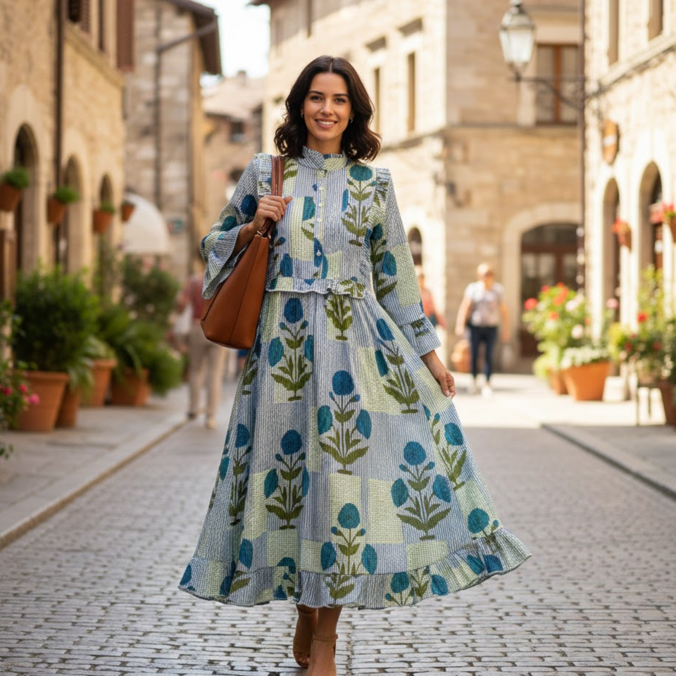 เดรสผ้าฝ้ายคอตั้งแต่งระบายสไตล์วิคตอเรียน พิมพ์ลายดอกไม้ทำมือ แขนยาว จับจีบเป็นชั้นๆ ทรงแม็กซี่ สำหรับผู้หญิง ผลงานชิ้นเอกประจำฤดูร้อน