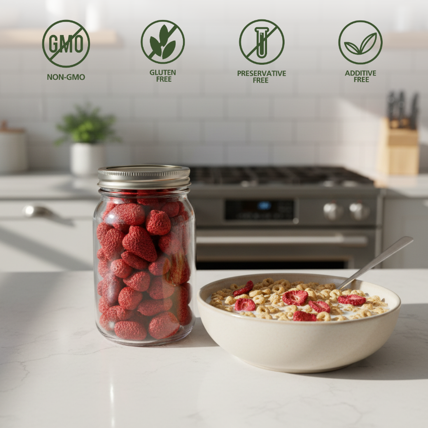วีเอ็นโต ขายส่งสตรอว์เบอร์รีอบแห้งแบบแช่แข็ง ผลไม้ธรรมชาติ ถนอมรักษาได้นาน ขนมเพื่อสุขภาพ ไม่มีน้ำตาล ผลิตในตุรกี
