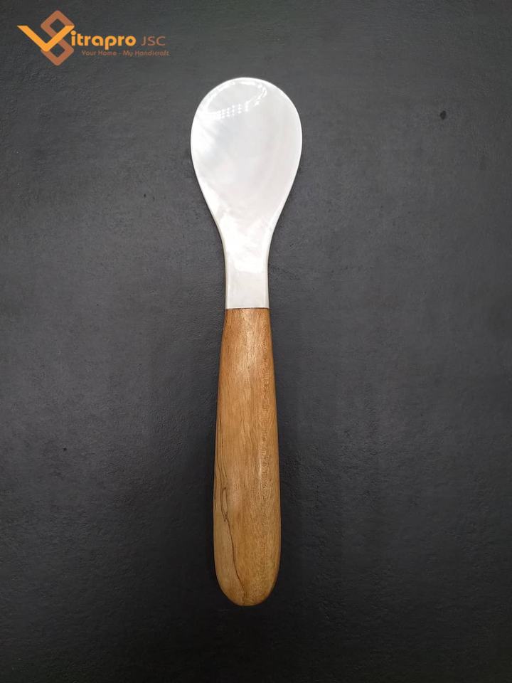 Viertnam แม่มุกสีขาวที่มีมือจับไม้ช้อนคาเวียร์เชลล์ช้อนอาหารค่ำเสิร์ฟช้อน
