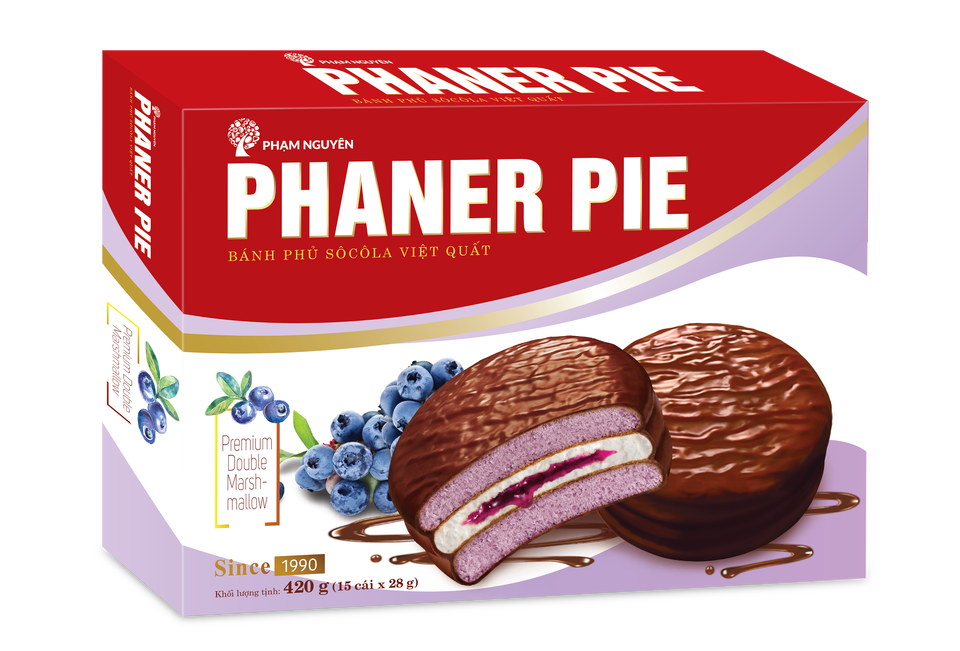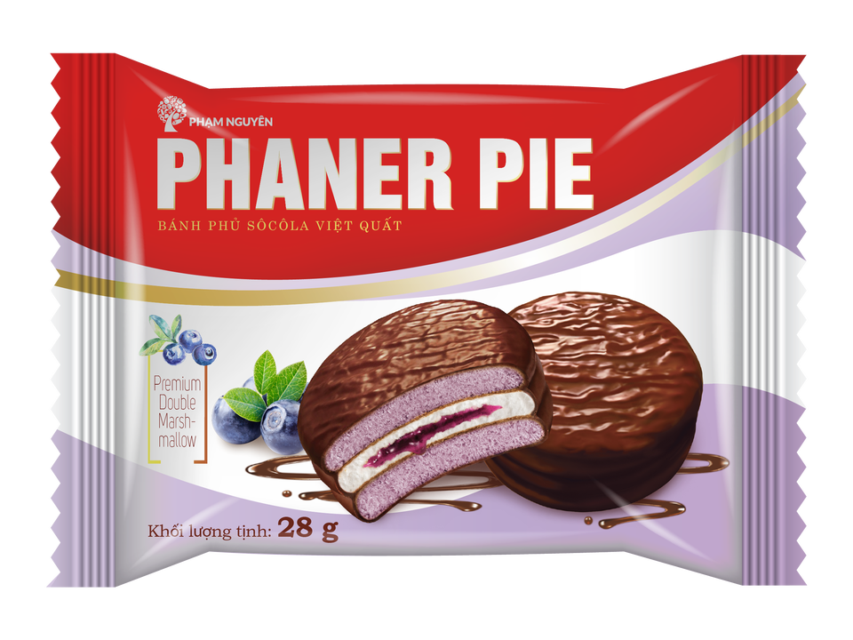 บิสกิตพายบลูเบอร์รี่เวียดนาม ฟานเออร์ เนื้อนุ่ม รสหวานเคลือบช็อกโกแลต ไส้มาชเมลโลว์ บรรจุกล่องใหญ่ ขายส่ง รับผลิตแบบ OEM/ODM