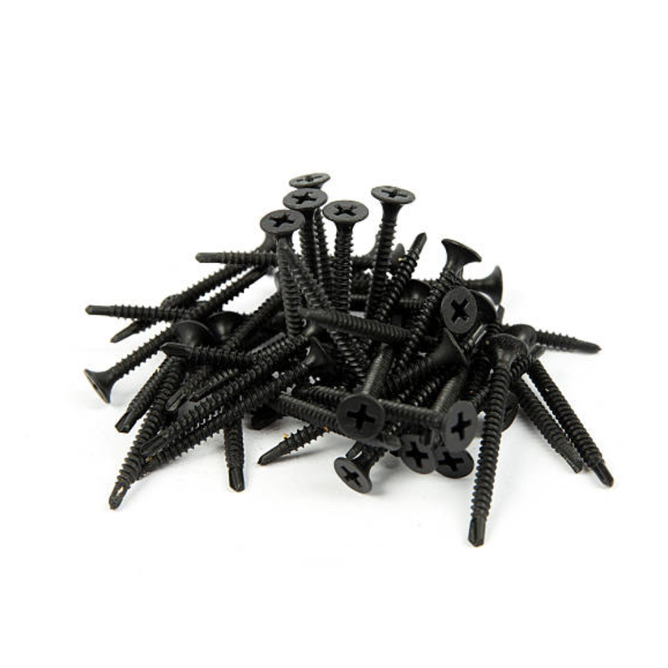 สกรูผนังเหล็กคาร์บอนในเวียดนามที่มีการติดตั้งด้ายหยาบในแผง drywall บนกรอบโลหะสีดำ