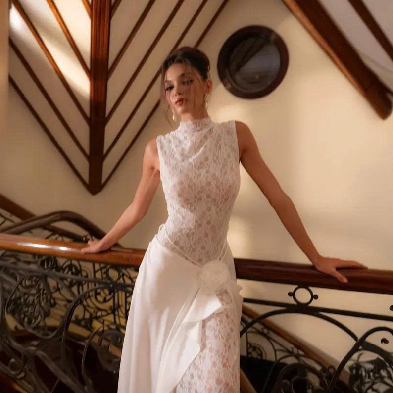สไตล์:แผ่นลูกไม้บางๆคอสูงและชุดเดรสผ้าไหมยาวเร้าอารมณ์